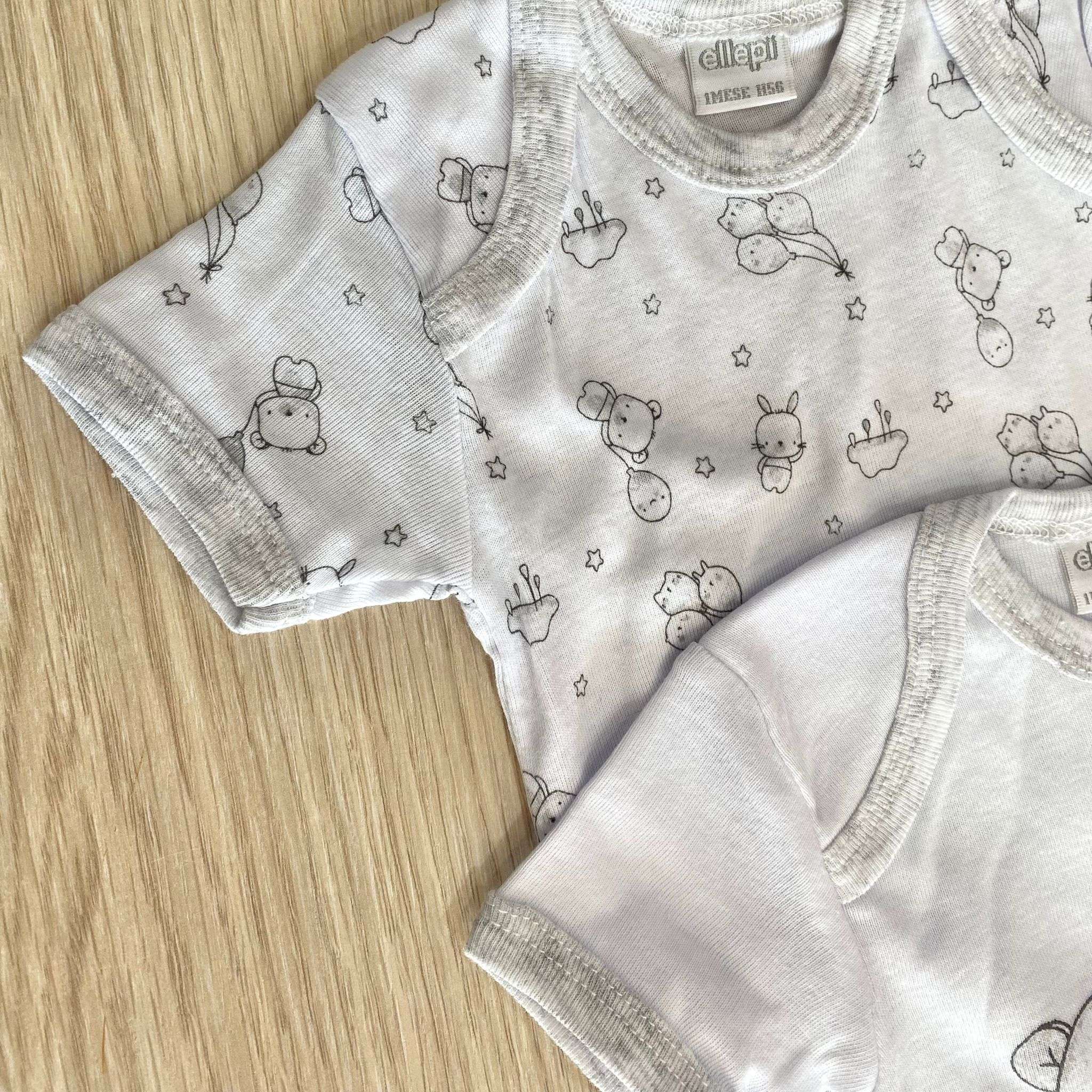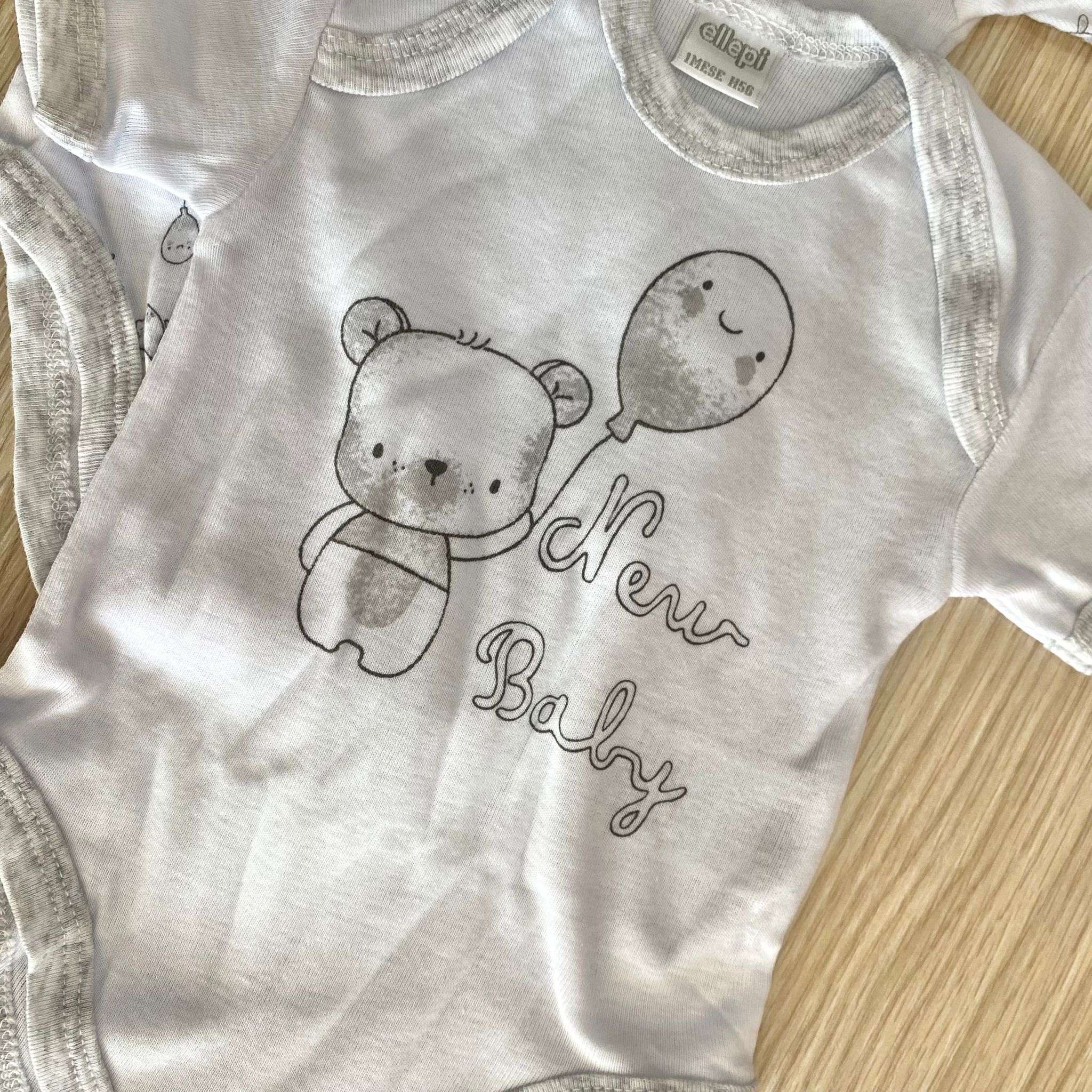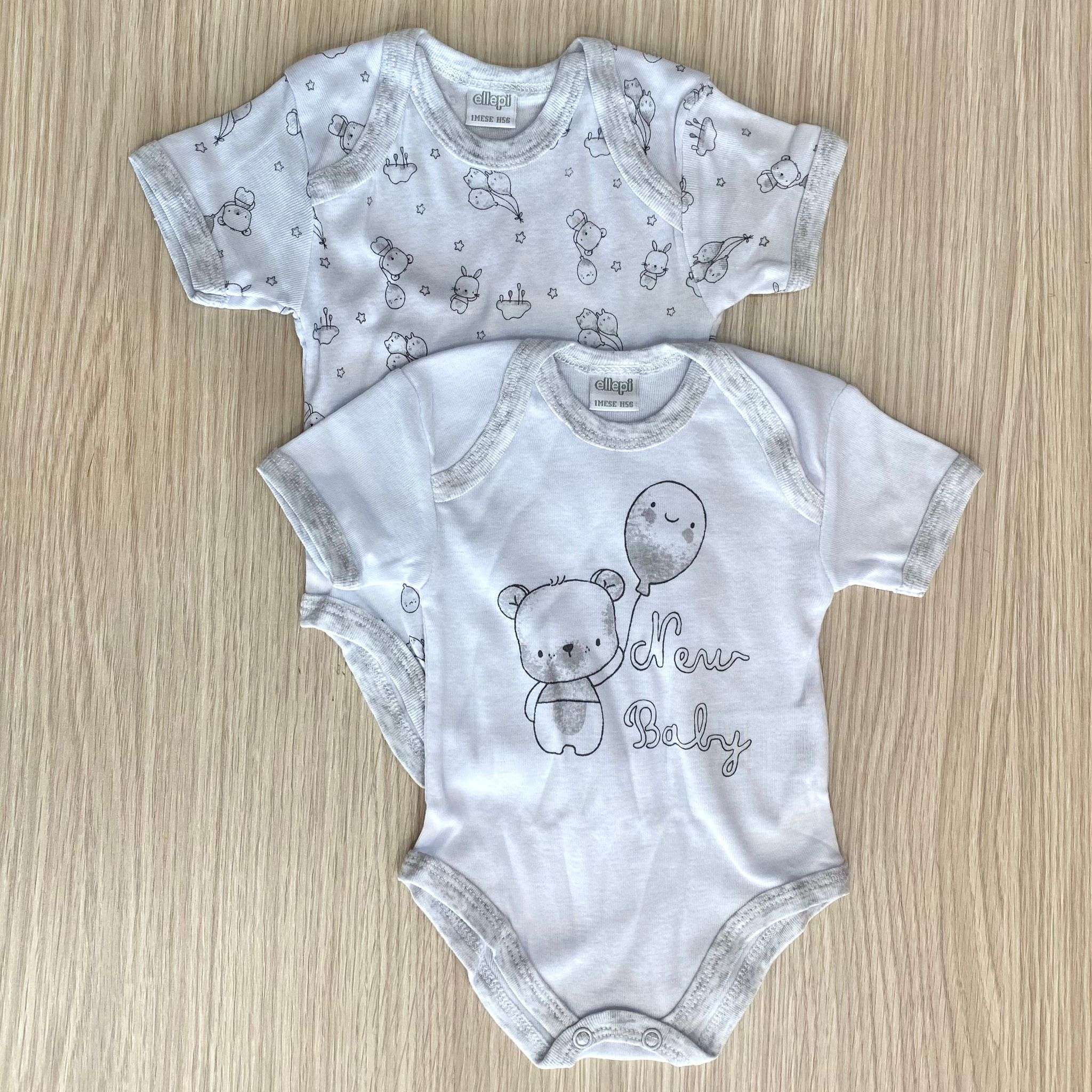 Coppia body neonato/a/bambino/a in cotone, di colore grigio e bianco.