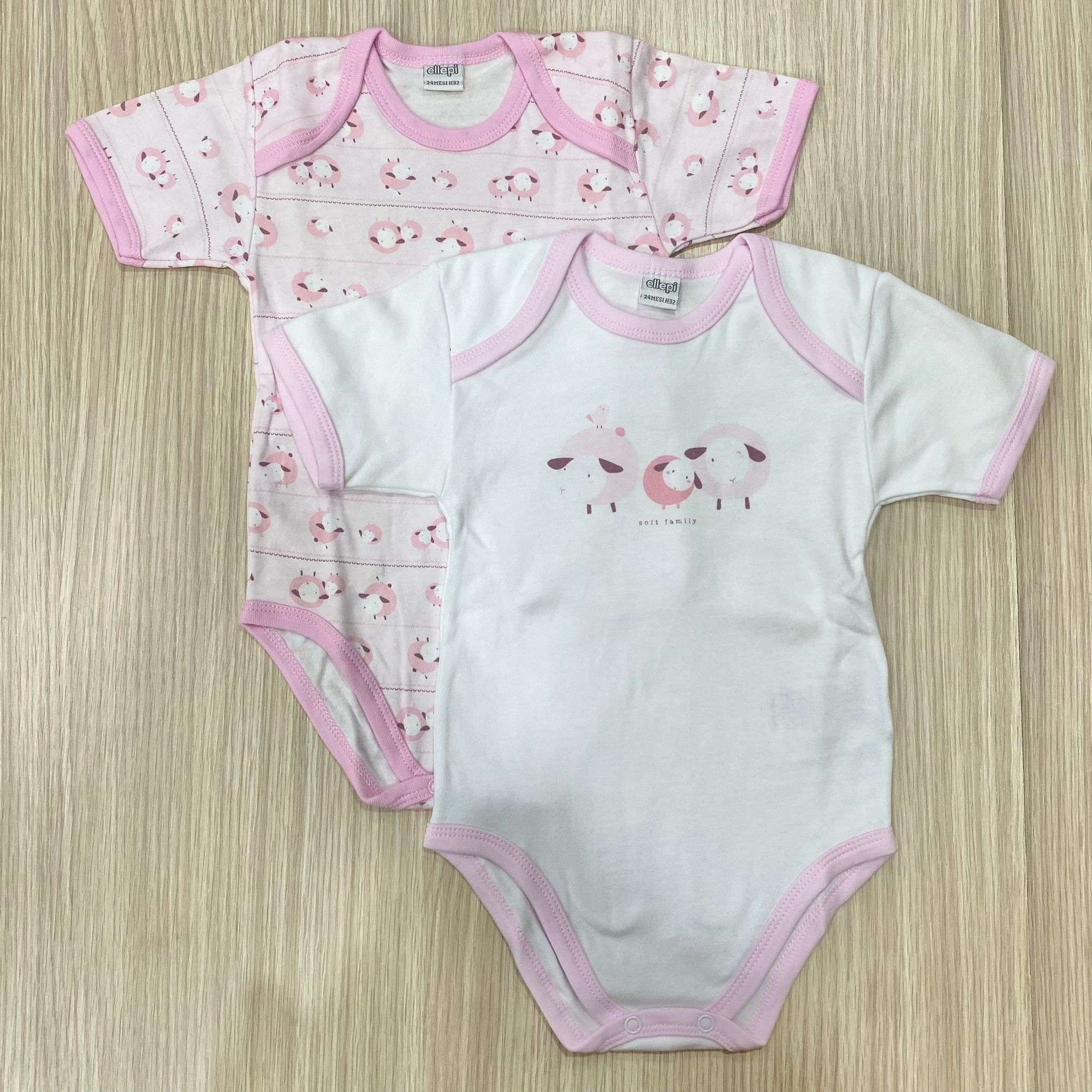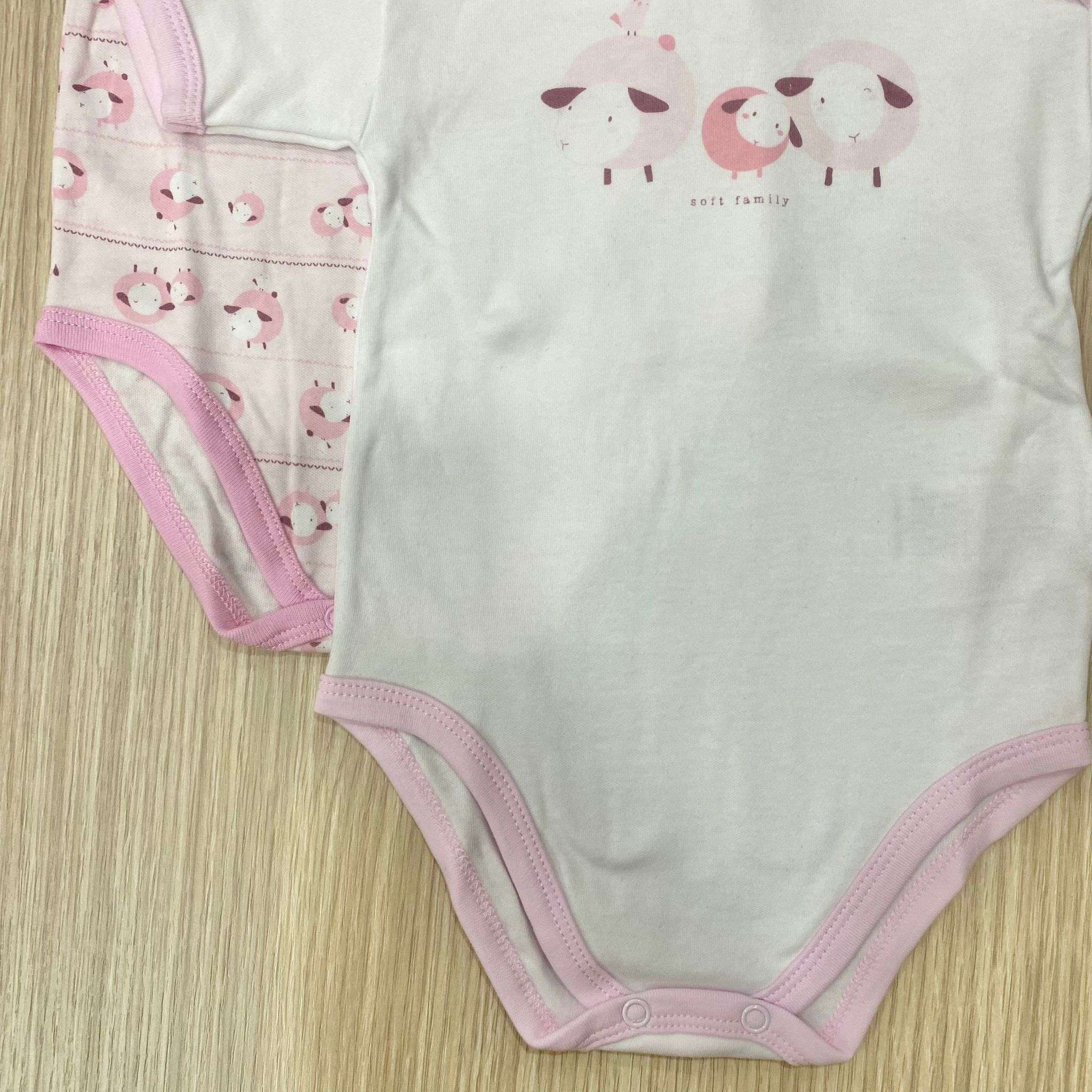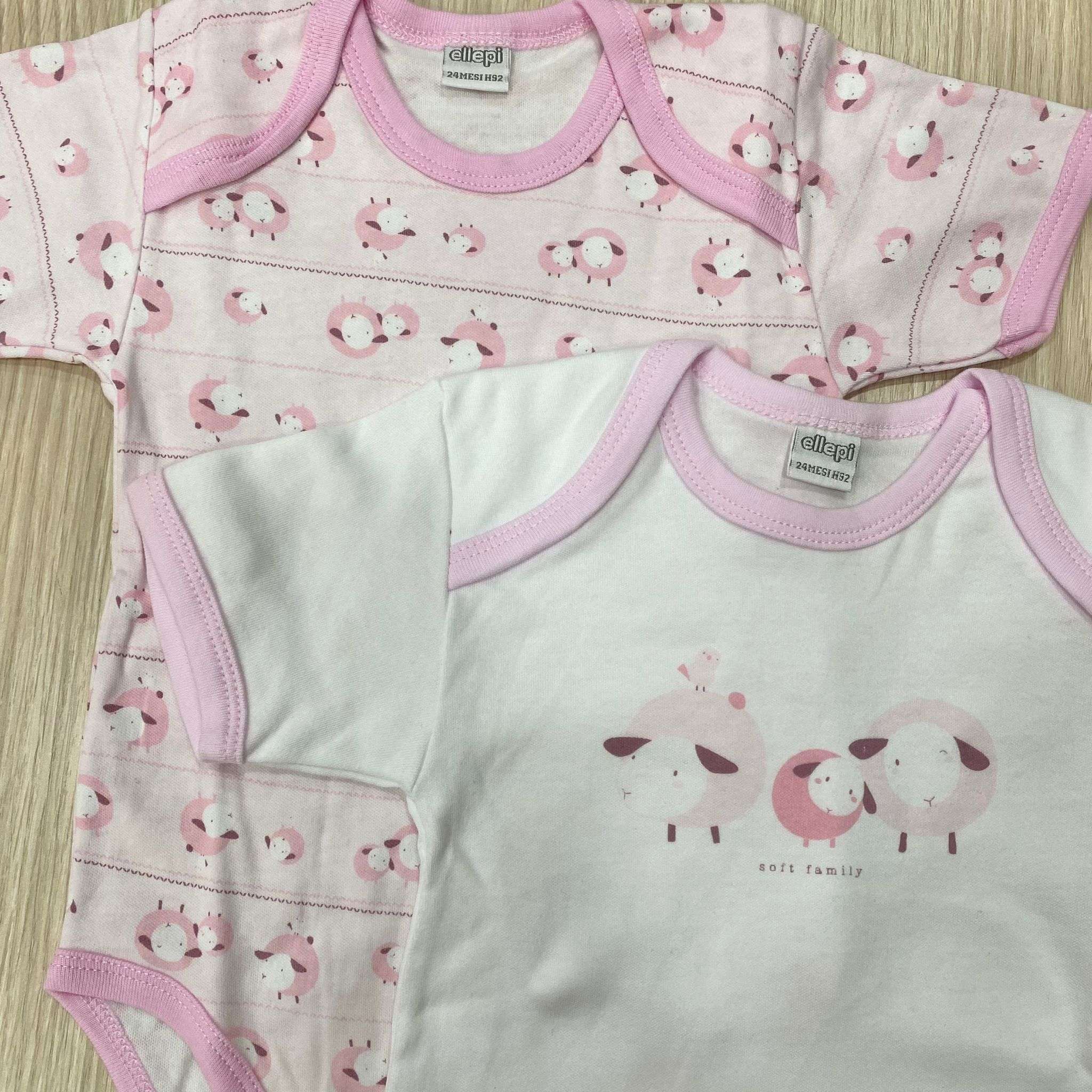 Coppia body neonata in caldo cotone leggermente felpato, di colore bianco e rosa.