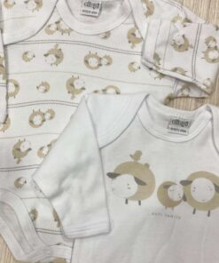 Coppia body neonato/a in caldo cotone leggermente felpato, di colore panna e beige.