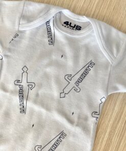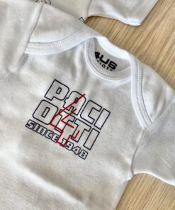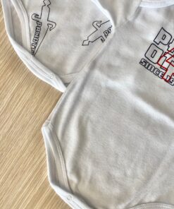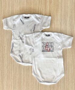 Coppia body neonato/bambino in cotone di colore bianco con stampa di colore blu e rosso.