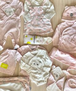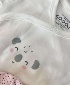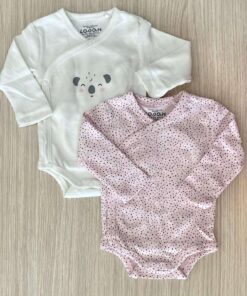 Coppia body neonata/bambina in caldo cotone, di colore panna e rosa, con dettagli di vari colori.