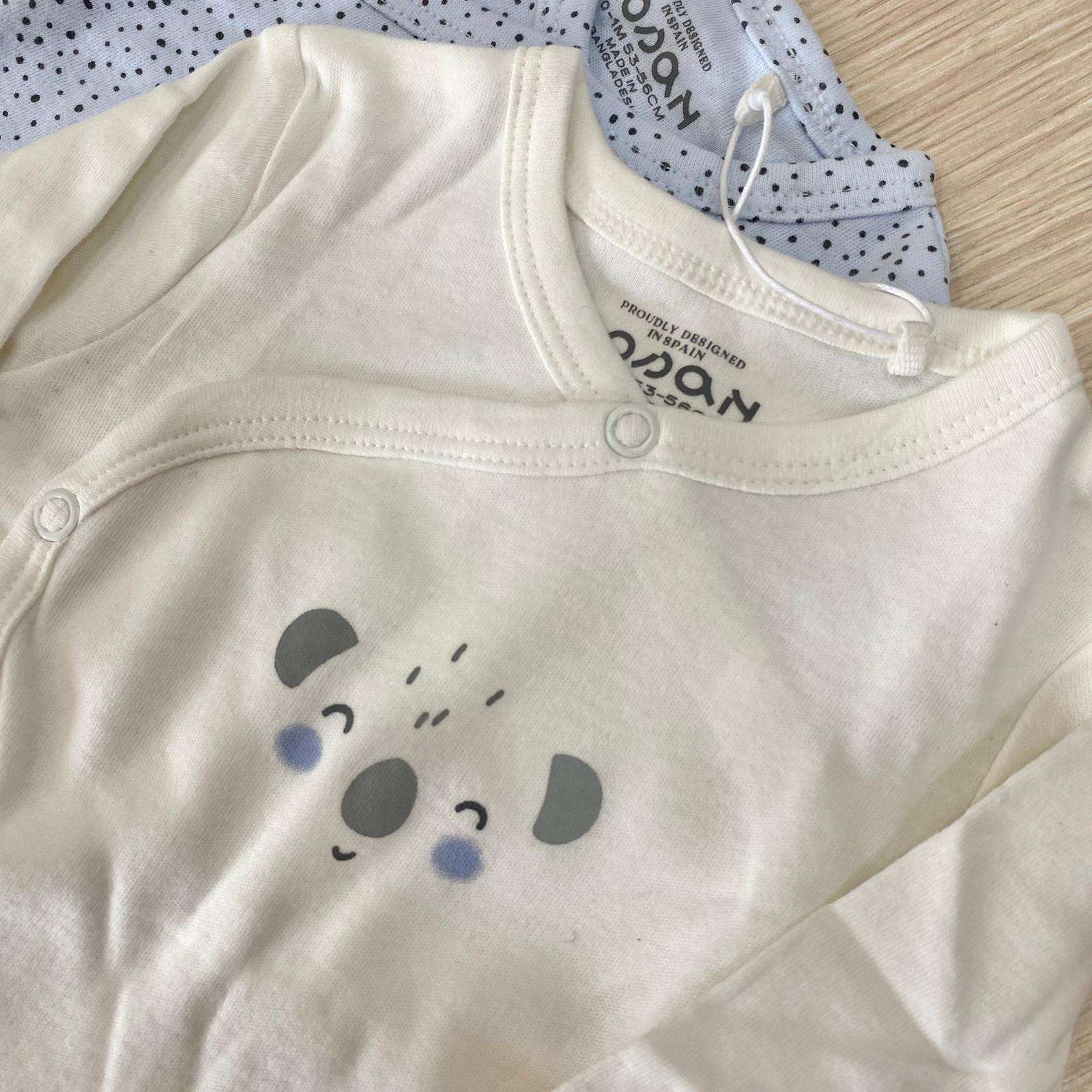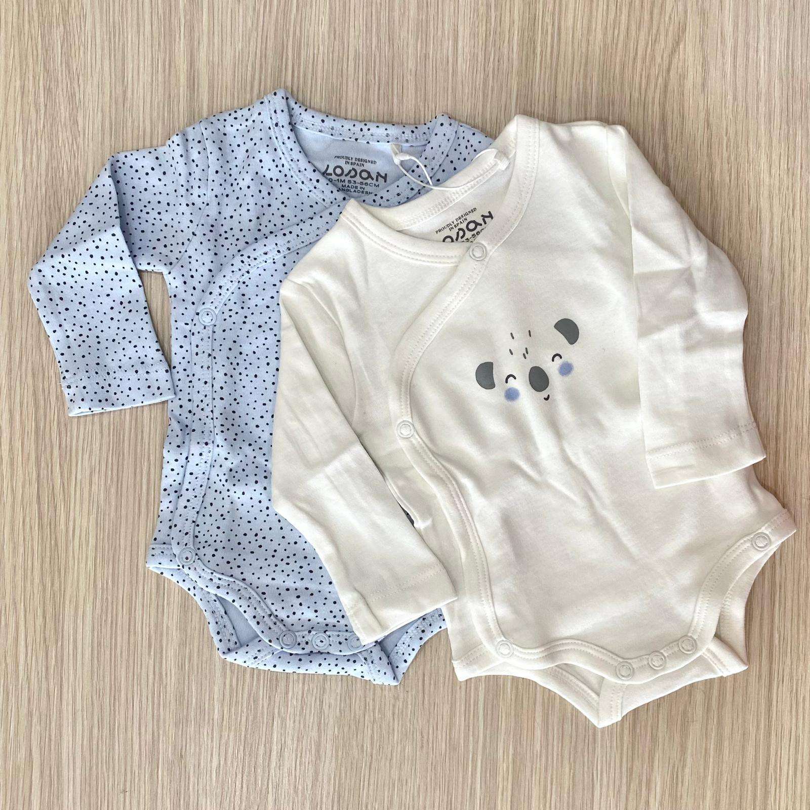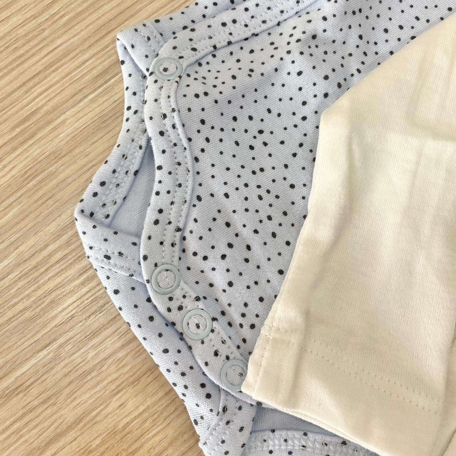 Coppia body neonato/bambino in caldo cotone, di colore panna e azzurro, con dettagli di vari colori.