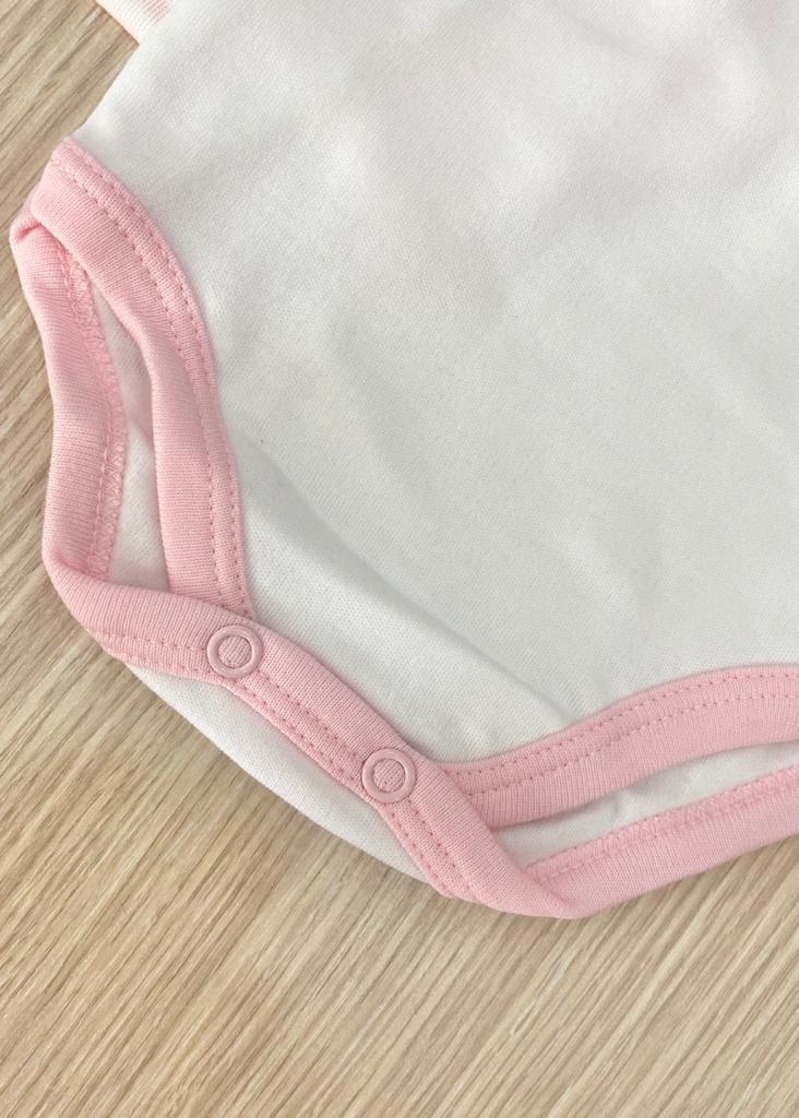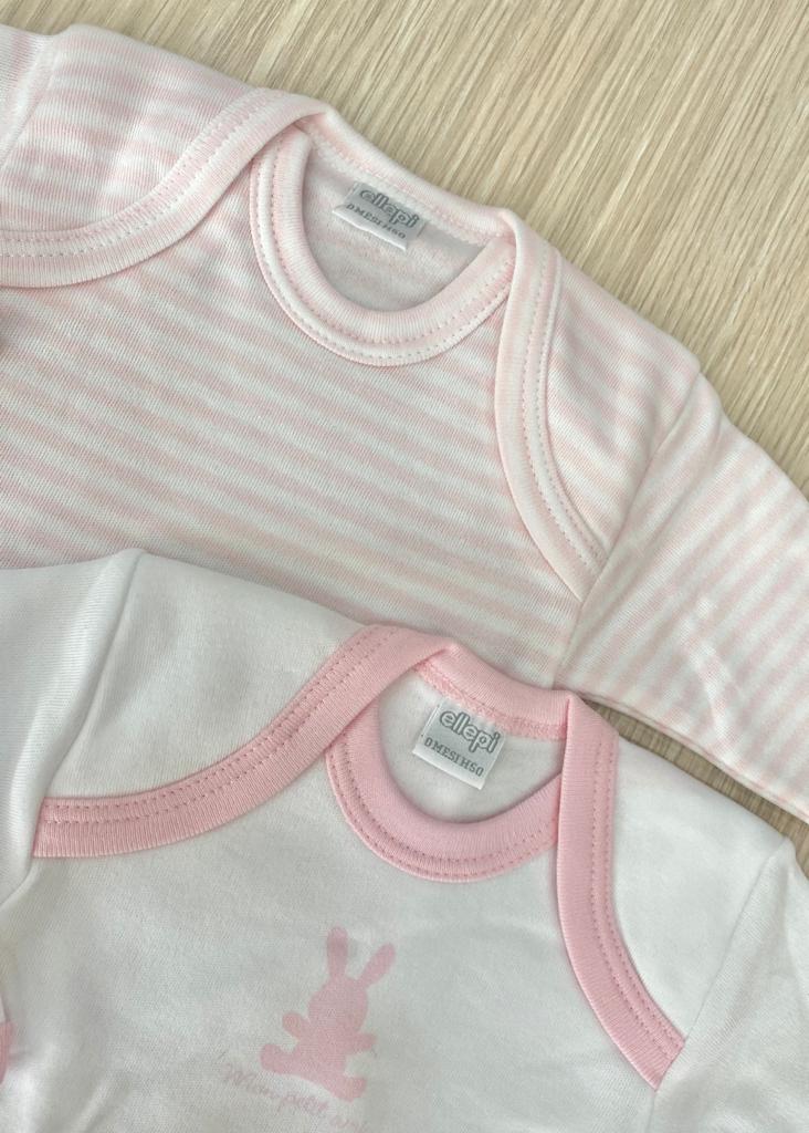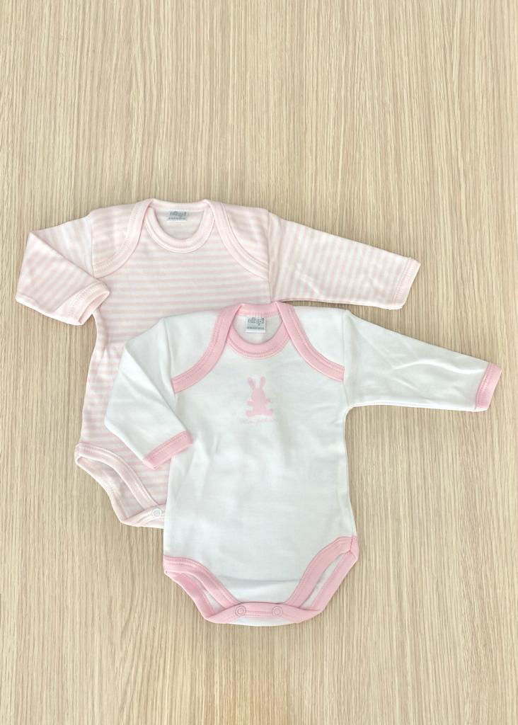 Coppia body neonata in morbido caldo cotone leggermente felpato, di colore rosa e bianco.