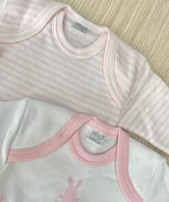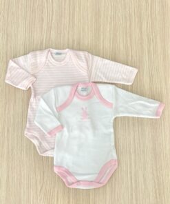 Coppia body neonata in morbido caldo cotone leggermente felpato, di colore rosa e bianco.