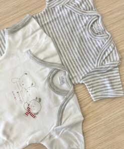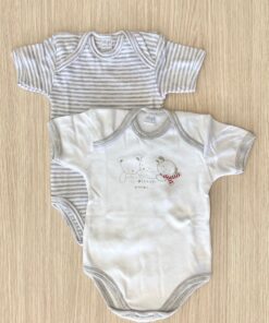 Coppia body neonato/a in morbido caldo cotone leggermente felpato, di colore bianco e grigio.