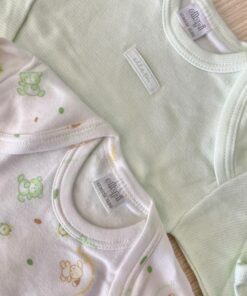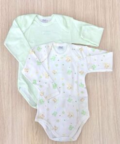 Coppia body neonato/a in morbido caldo cotone leggermente felpato, di colore verde e bianco.