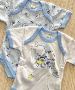 Coppia body neonato in cotone, di colore bianco e azzurro, con disegni di vari colori.