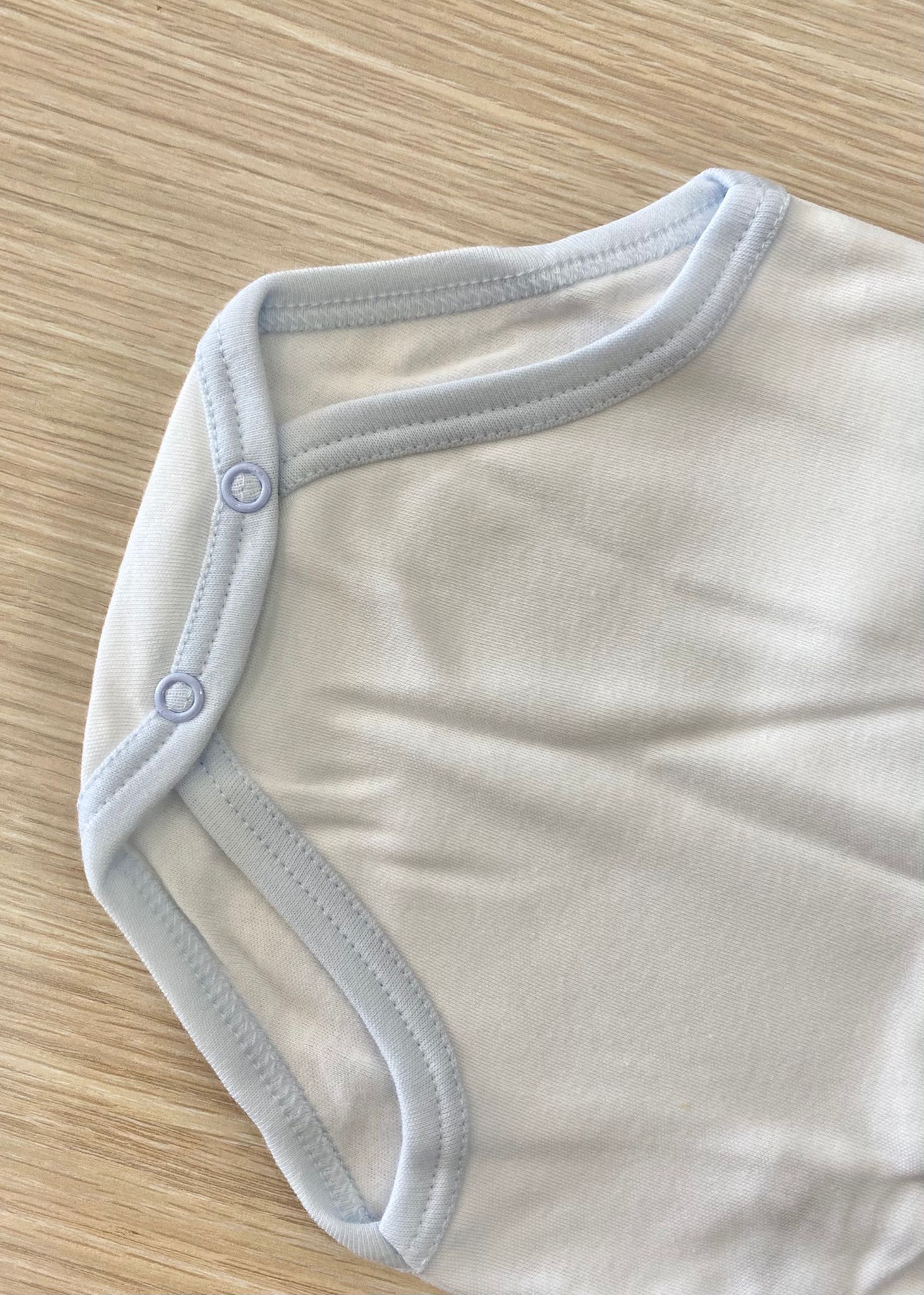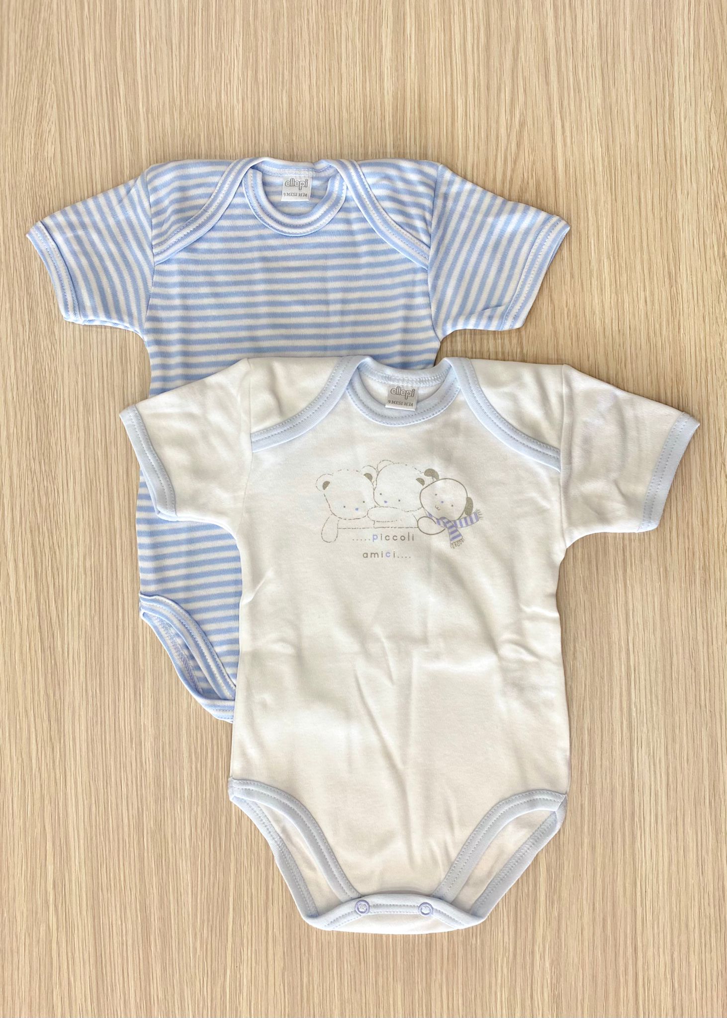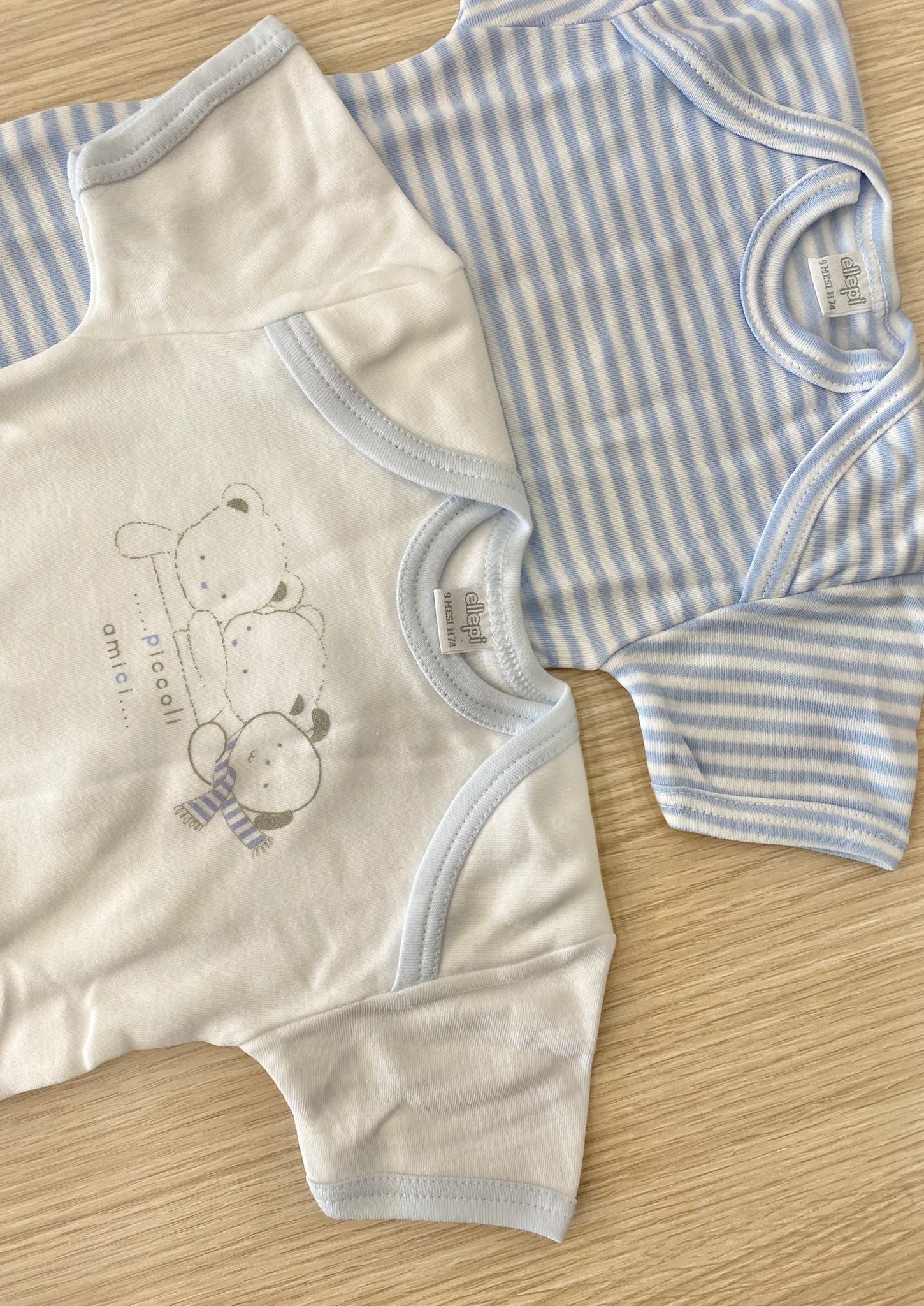 Coppia body neonato in morbido caldo cotone leggermente felpato, di colore bianco e azzurro.