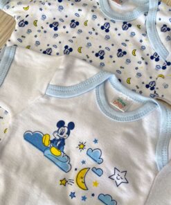 Coppia body in caldo cotone, di colore bianco e azzurro con disegno di vari colori.