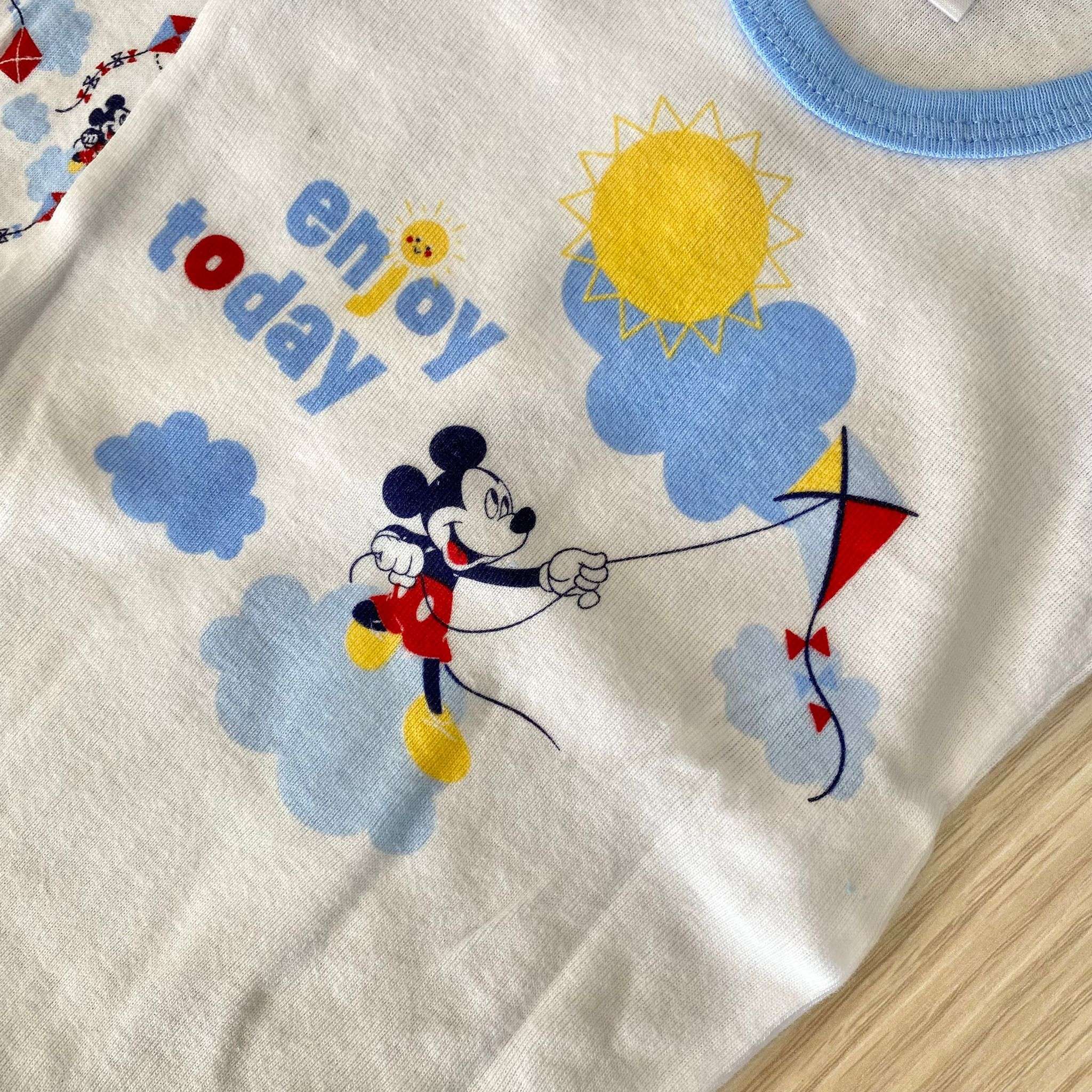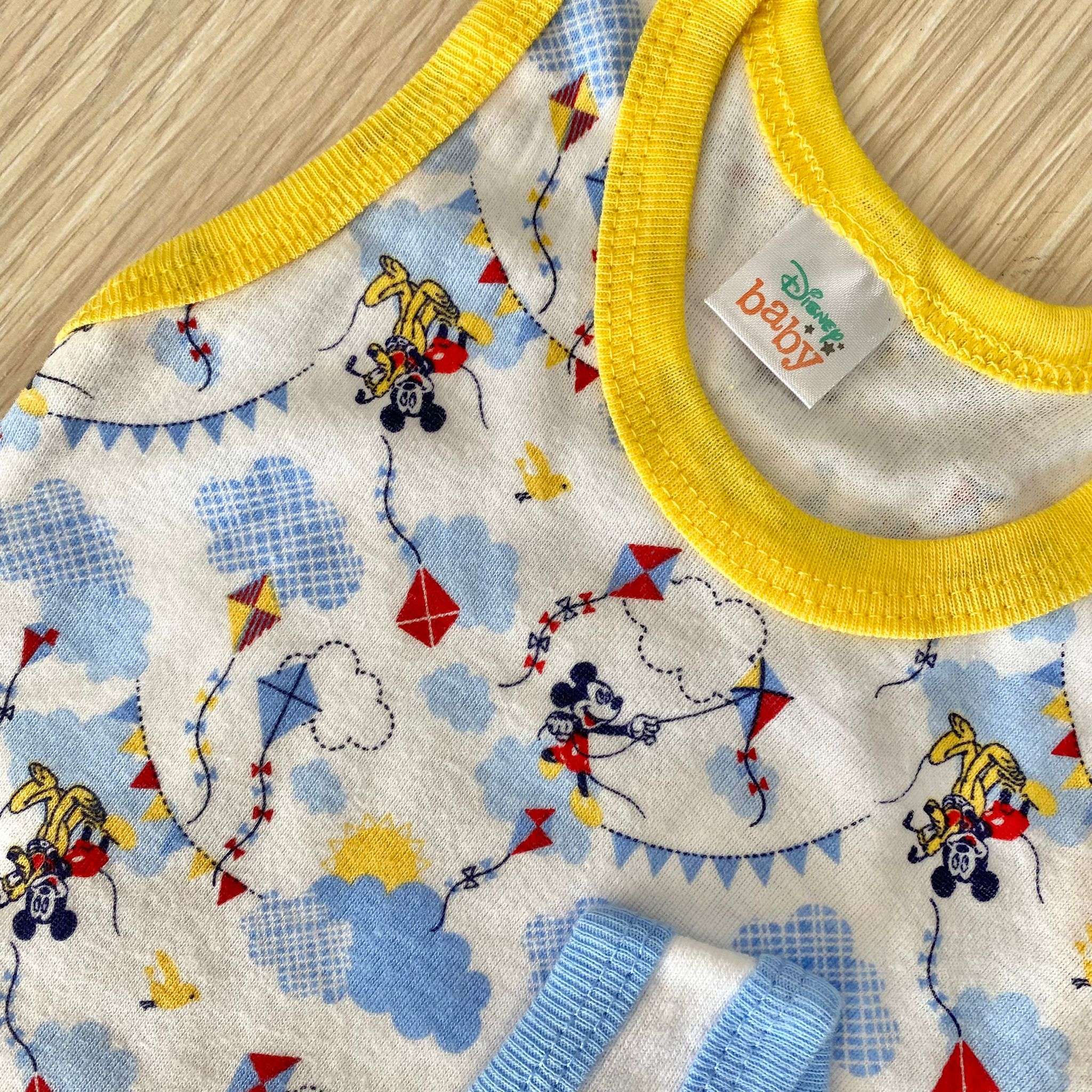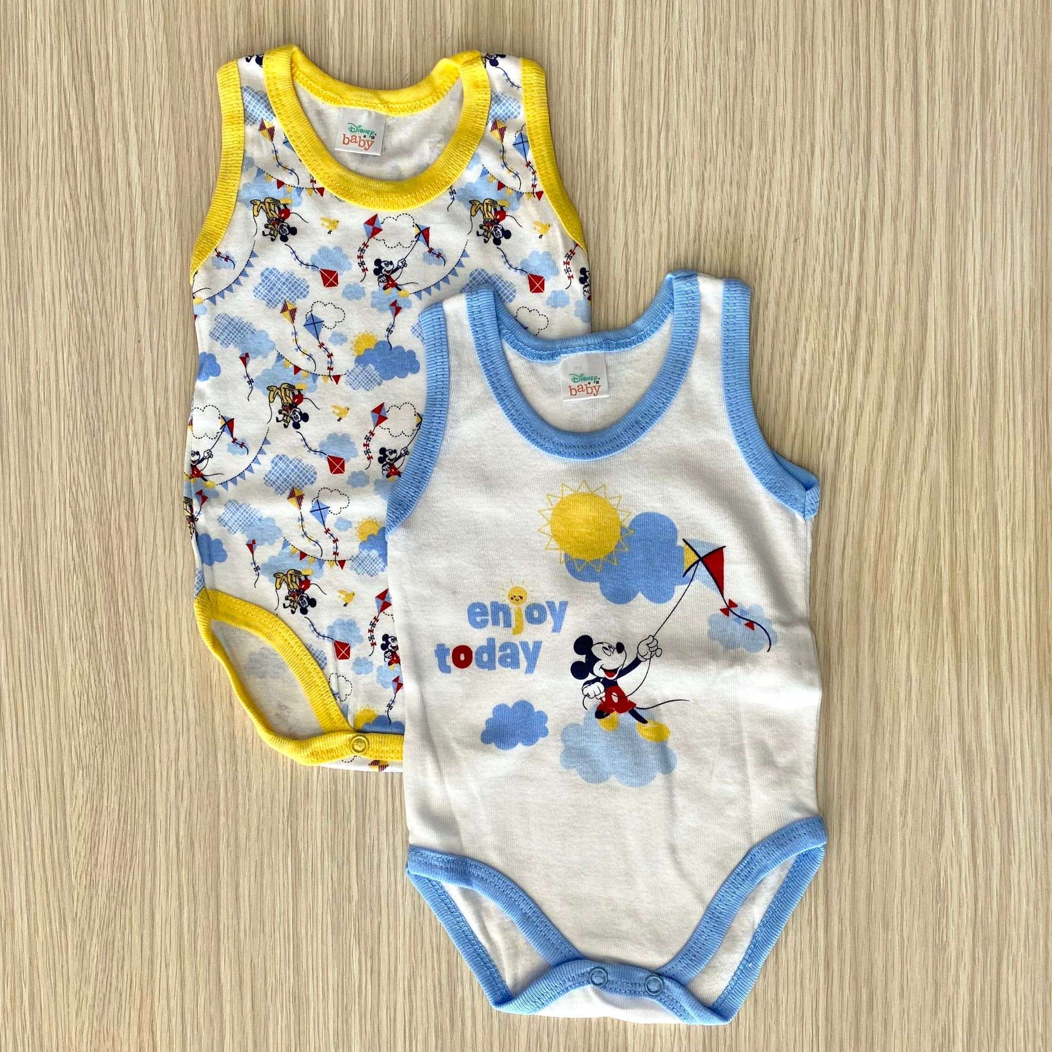 Coppia body in cotone, di colore bianco, azzurro e giallo con disegno di vari colori.