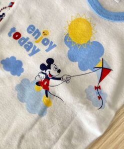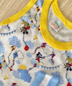 Coppia body in cotone, di colore bianco, azzurro e giallo con disegno di vari colori.