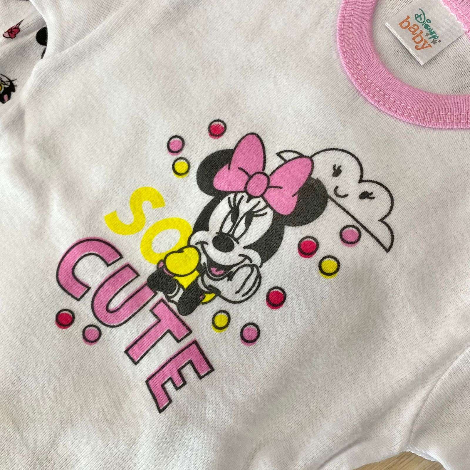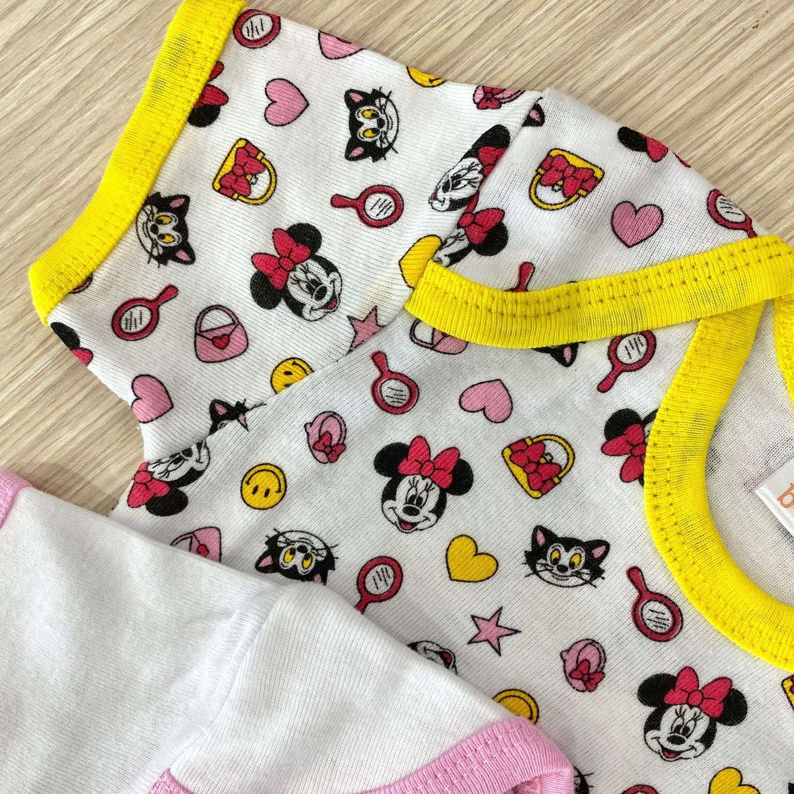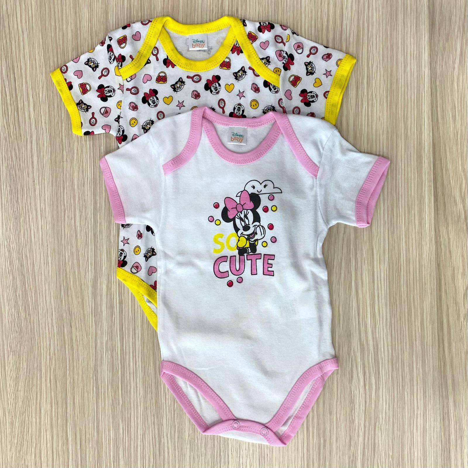 Coppia body in cotone, di colore bianco, rosa e giallo con disegno di vari colori.