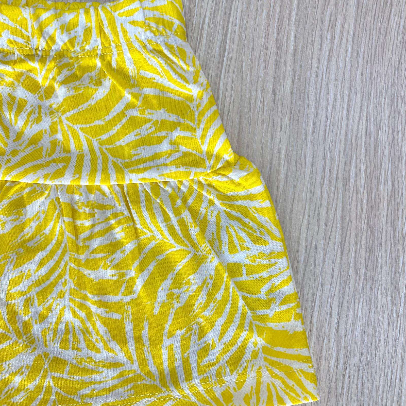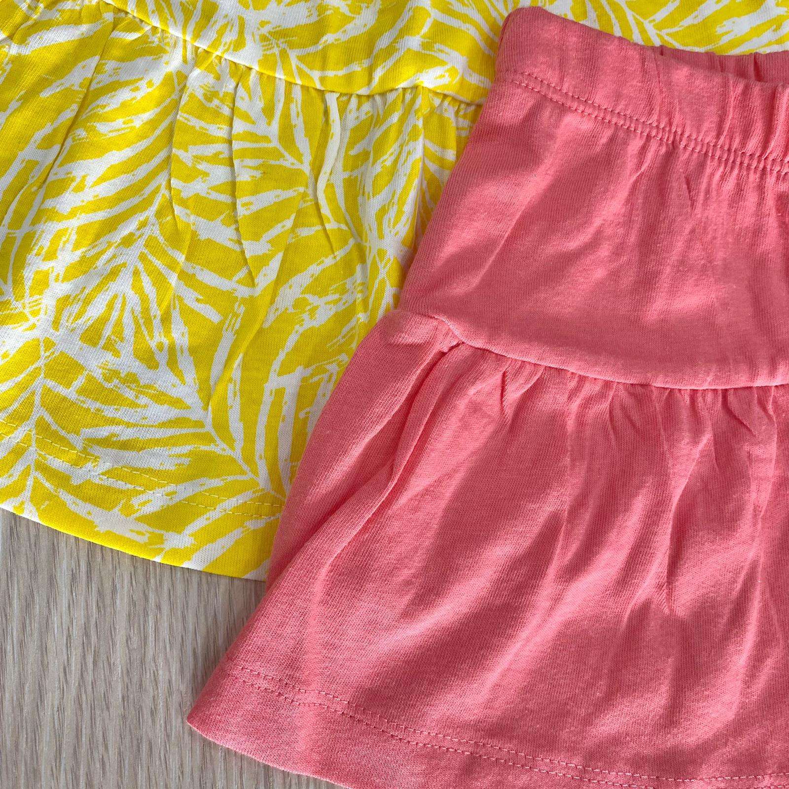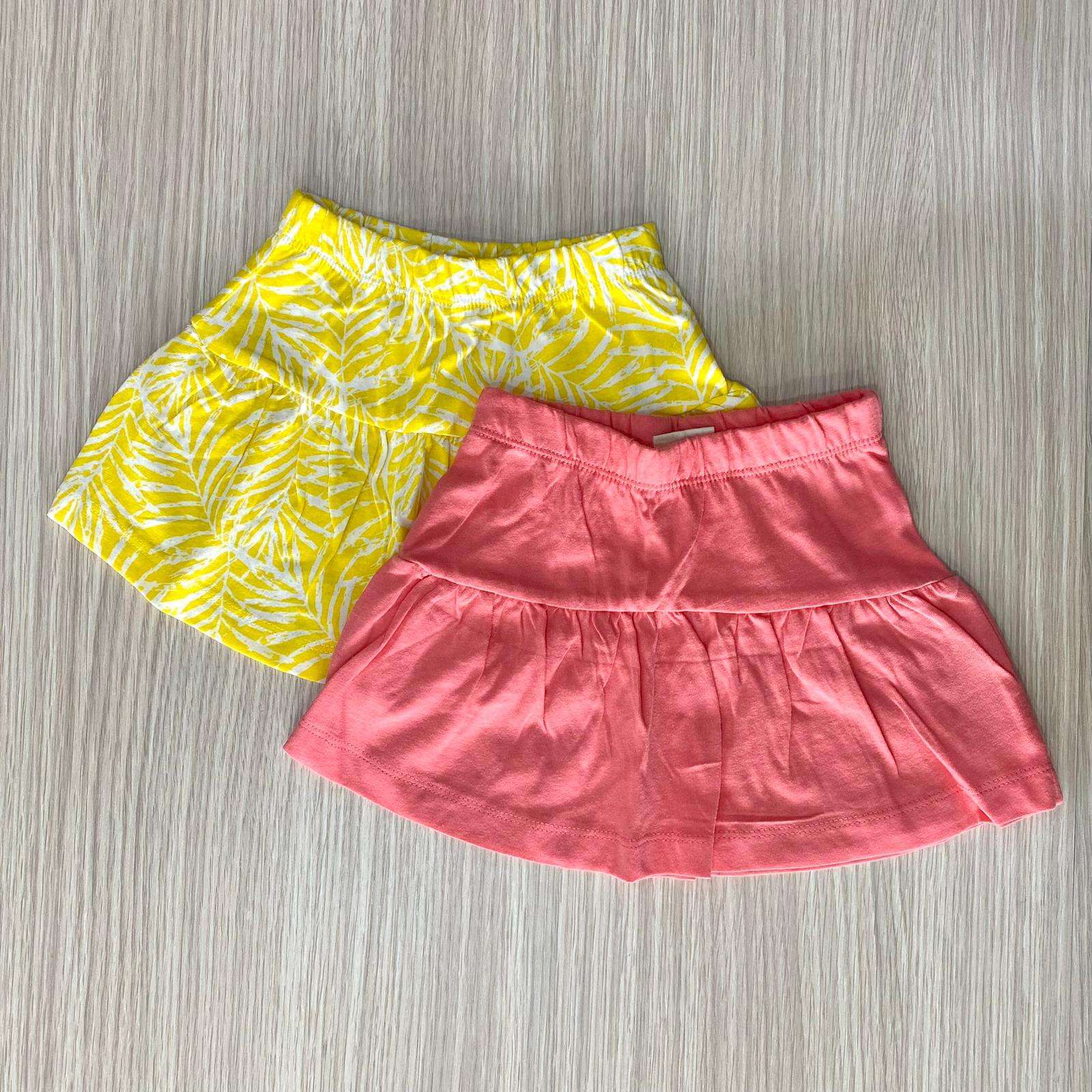 Coppia gonna bambina in cotone, di colore salmone, bianco e giallo.