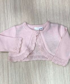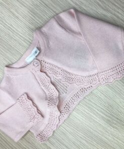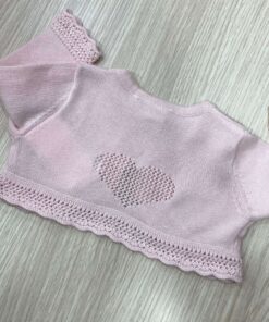 Coprispalle neonata/bambina in filo di cotone, di colore rosa, con dettaglio di cuoricino e bordino lavorato a maglia. Coprispalle con chiusura a bottoncino.