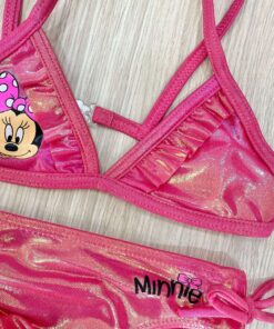 Costume bikini bambina, di colore rosa, con dettaglio olografico disegno Minnie.
