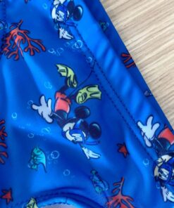 Costume slip da mare bambino in morbido tessuto, di colore blu, con disegni Mickey Mouse di vari colori.