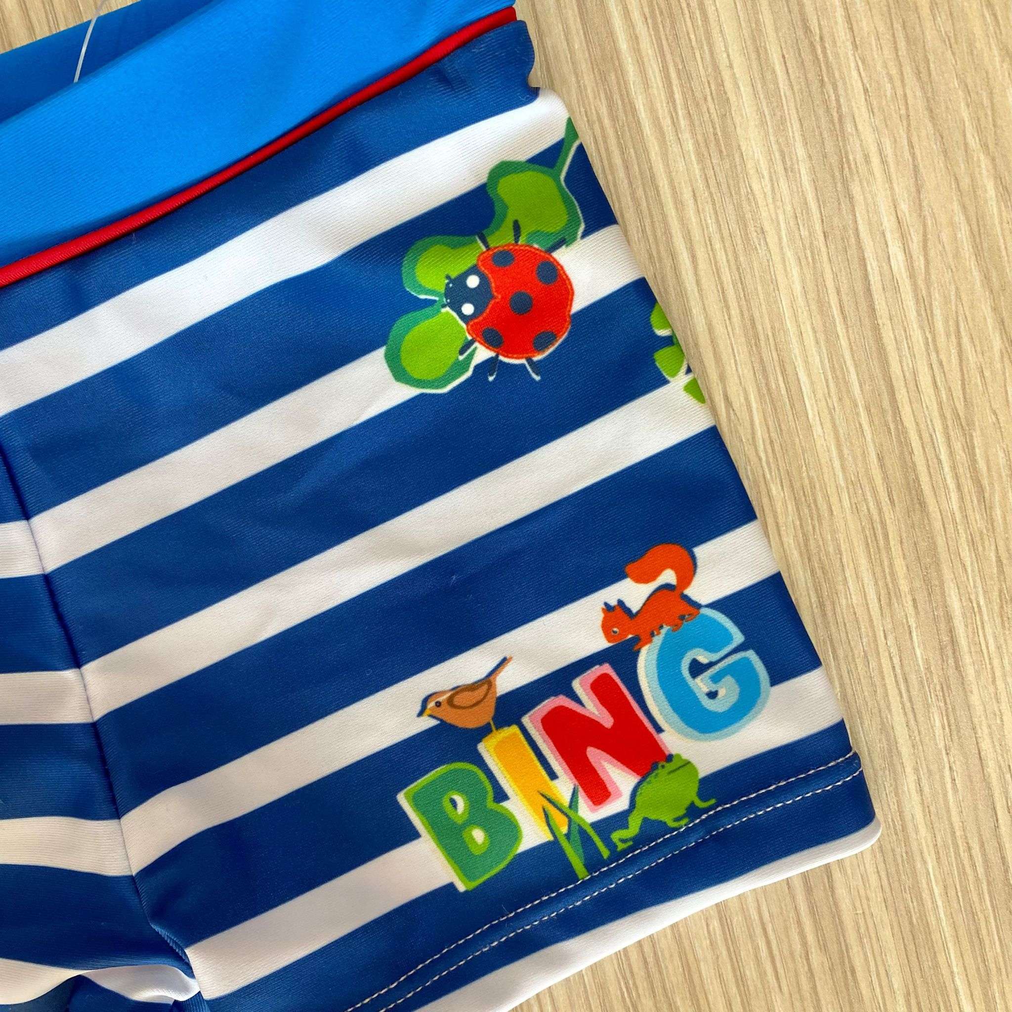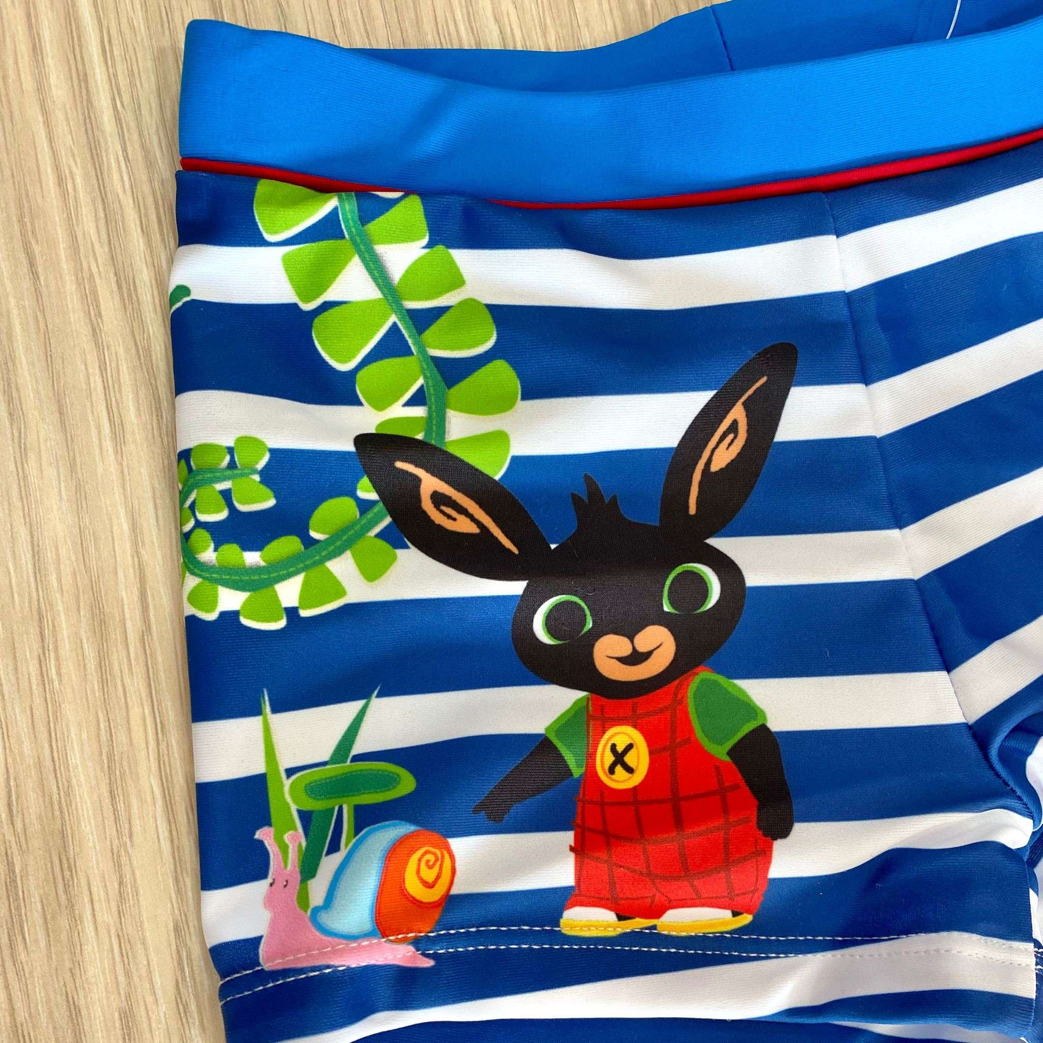 Costume da mare bambino a boxer, di colore blu, bianco, con disegno Bing di vari colori.