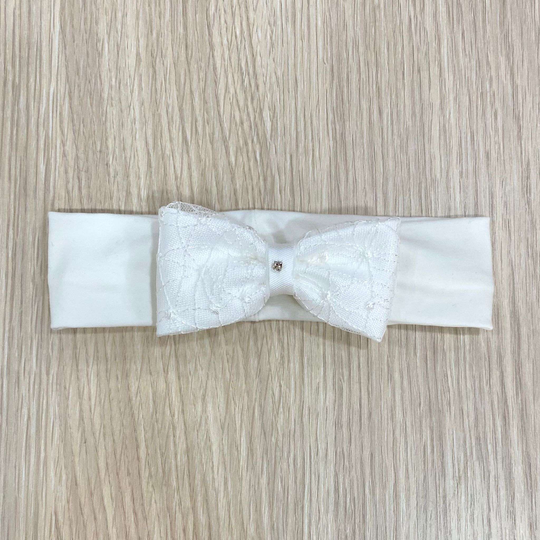 Fascetta bambina in cotone elasticizzato, di colore panna, con applicazione di fiocco.