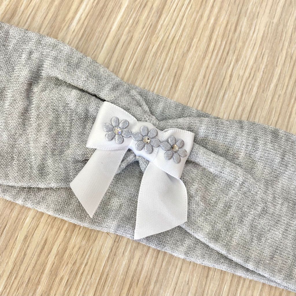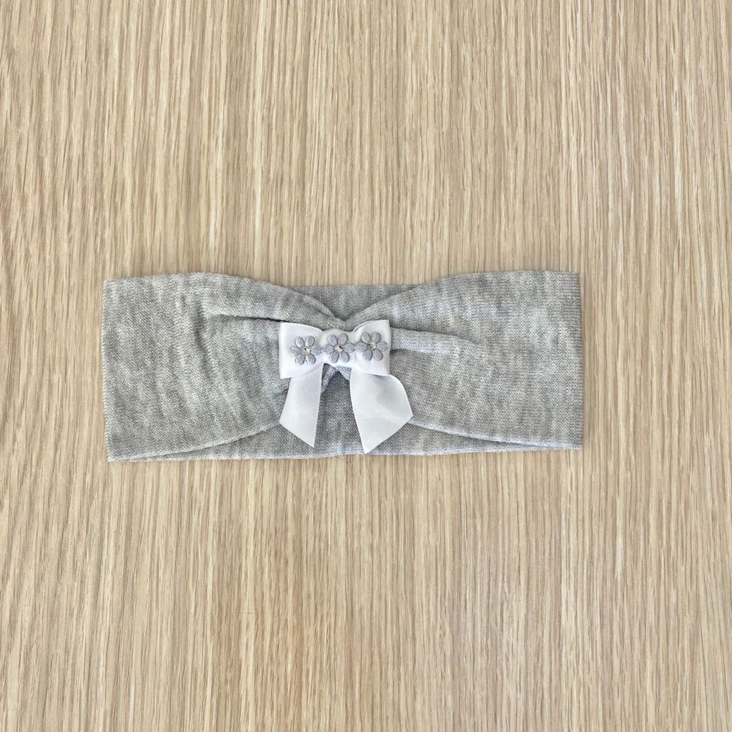 Fascetta neonata/bambina in tessuto elasticizzato, di colore grigio, con fiocco e applicazione di fiorellini e strass.