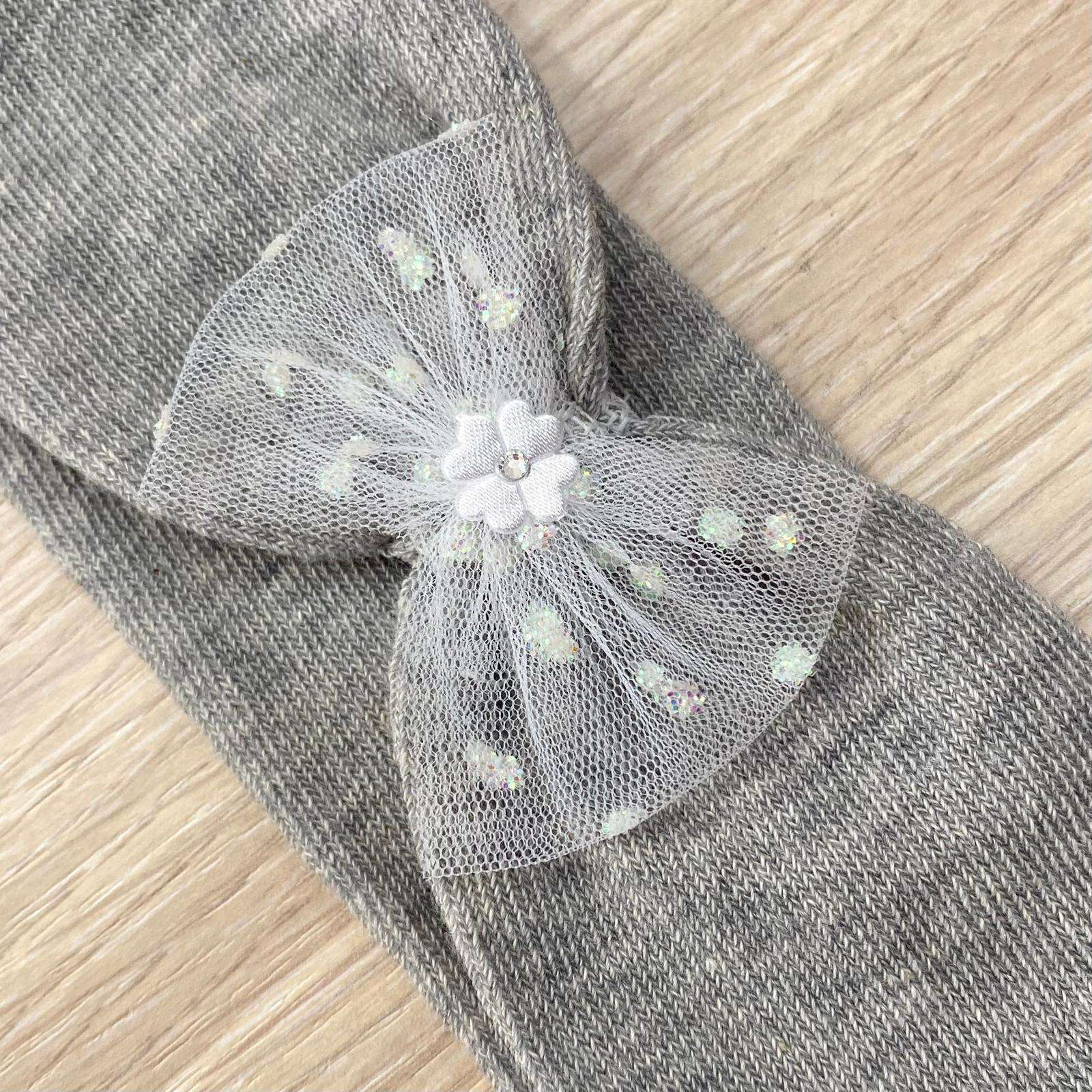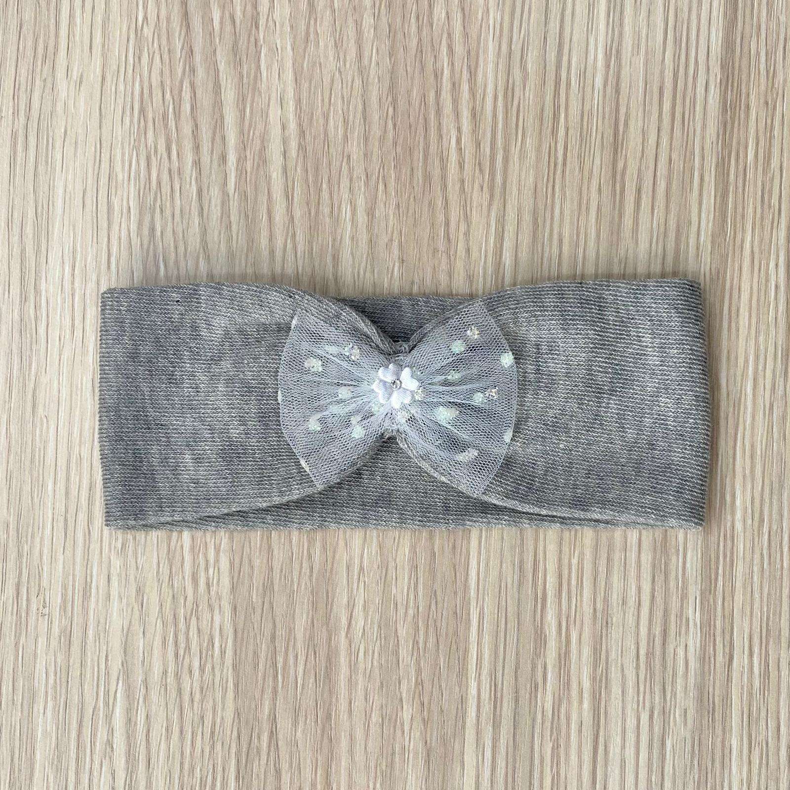 Fascetta neonata/bambina in cotone elasticizzato, di colore grigio, con applicazione di fiocchetto e dettagli argentati.