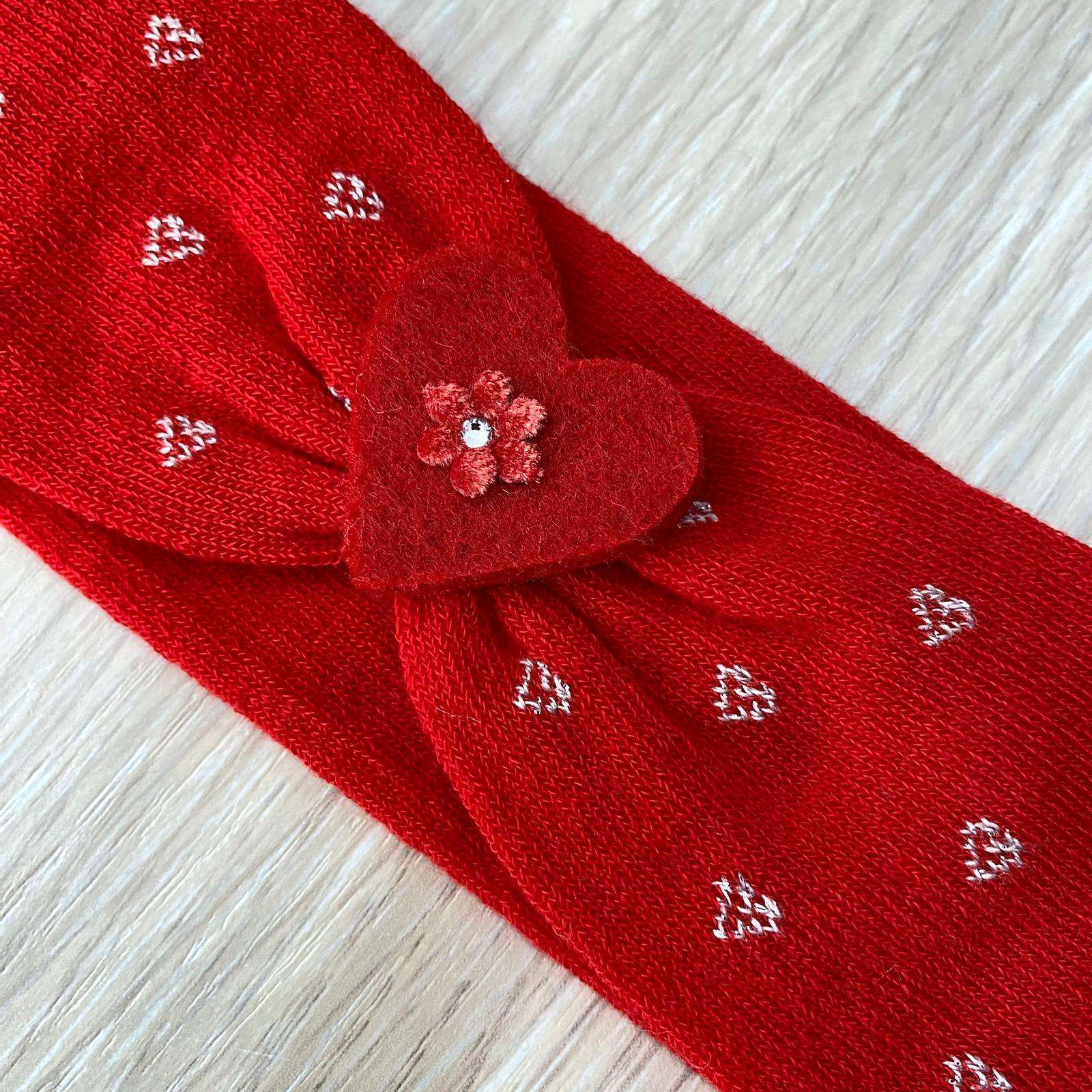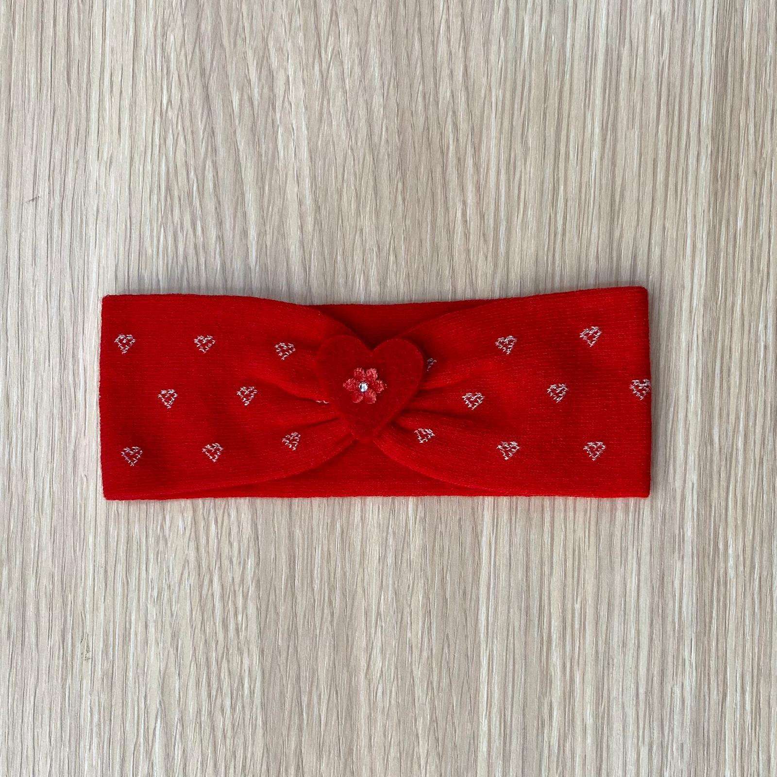 Fascetta neonata/bambina in cotone elasticizzato, di colore rosso, con applicazione di cuoricino e dettagli in filo argentati.