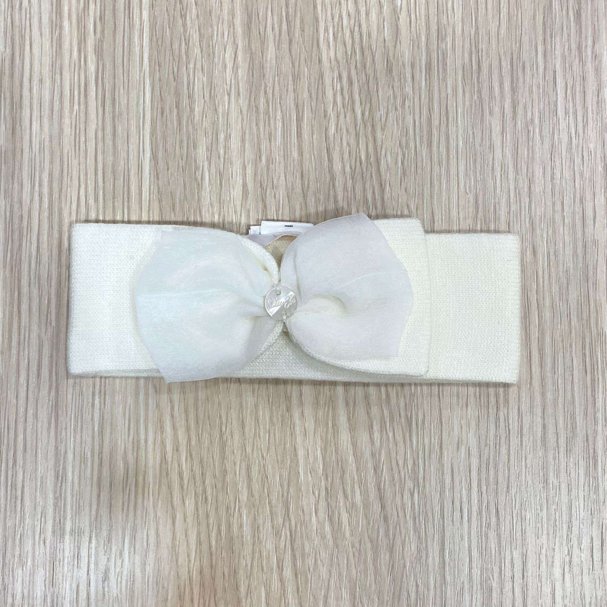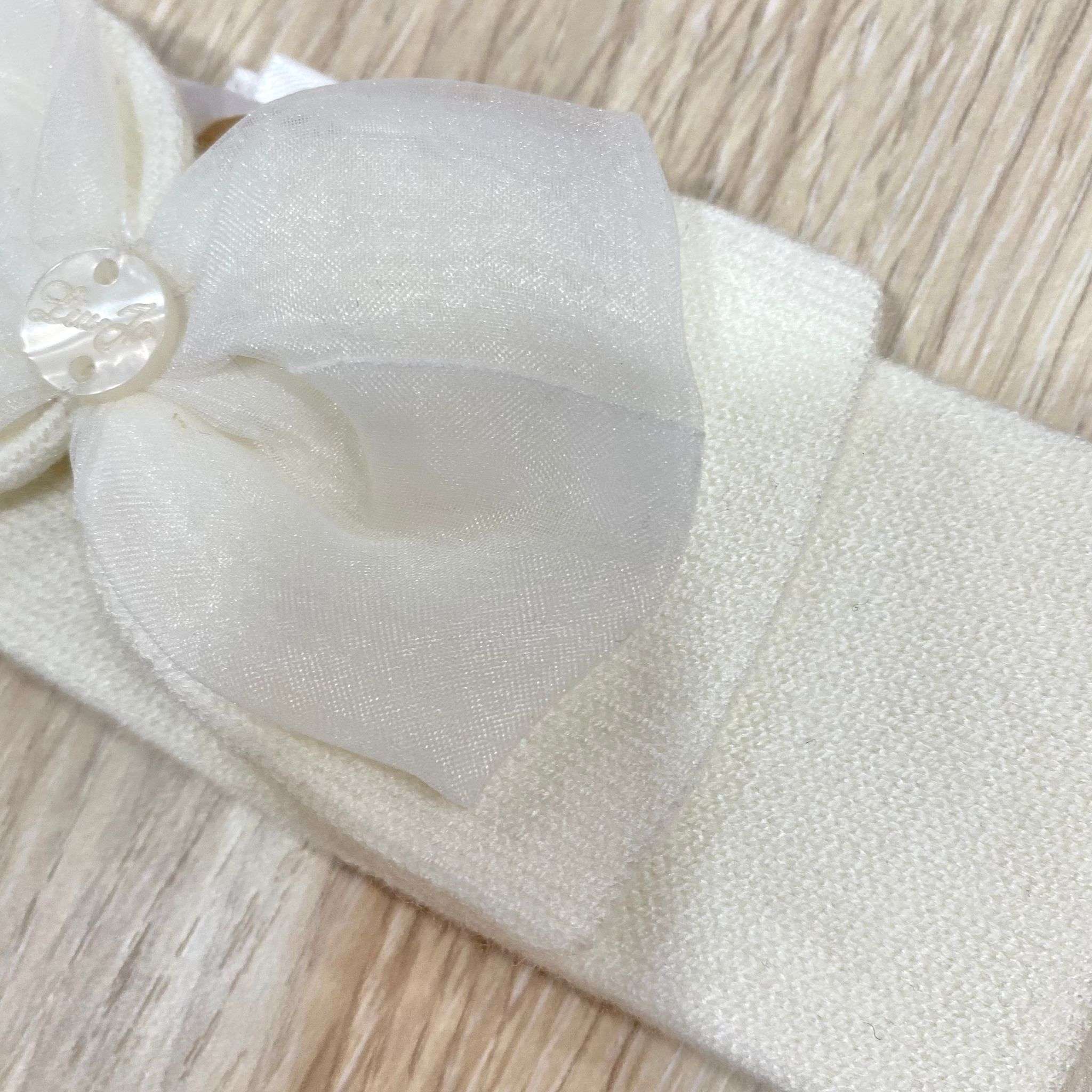 Fascetta neonata/bambina in caldo tessuto elasticizzato, di colore burro, con applicazione di fiocchetto in organza.