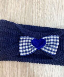 Fascetta neonata, di colore blu, in tessuto elasticizzato, con applicazione centrale di un fiocco e un piccolo cuoricino blu.
