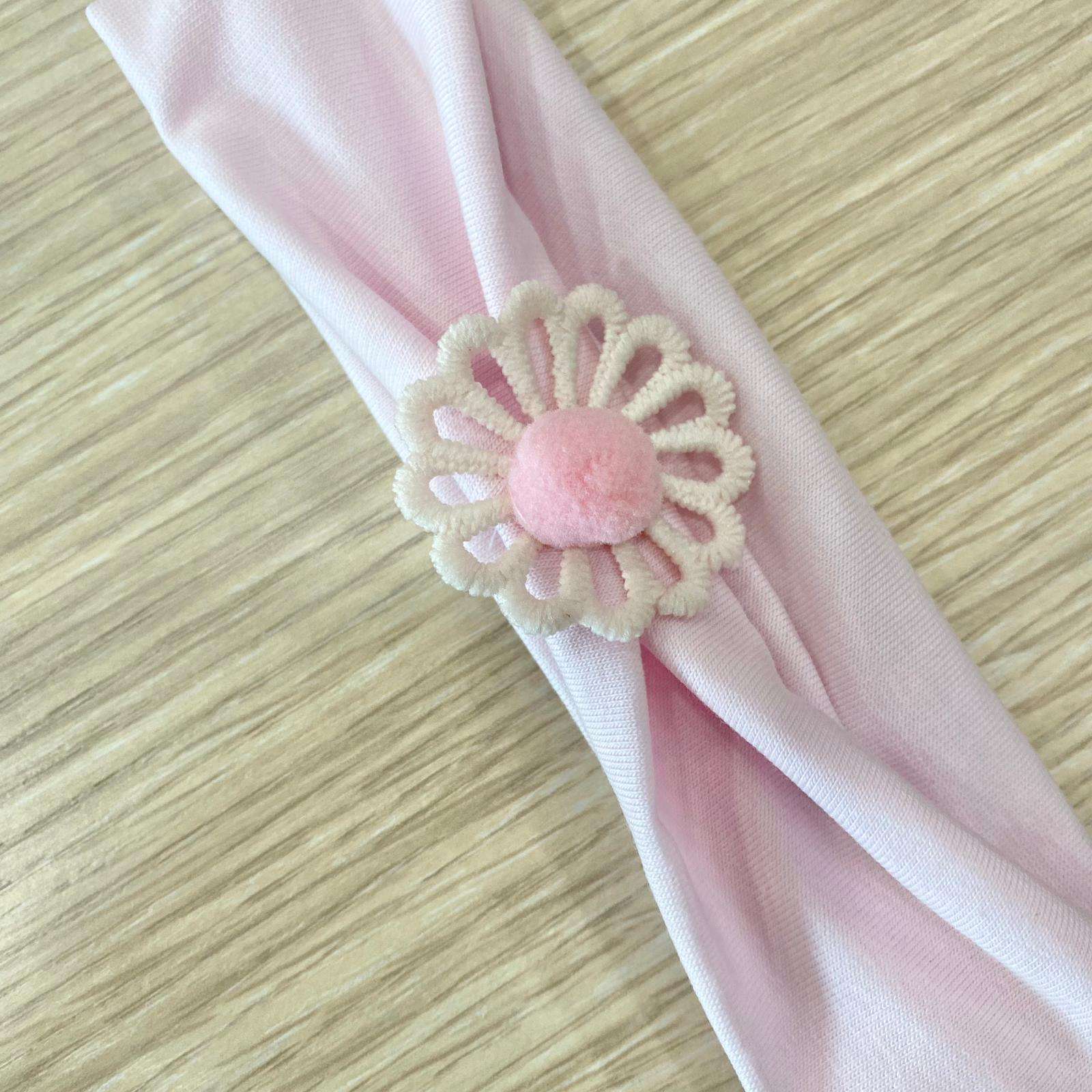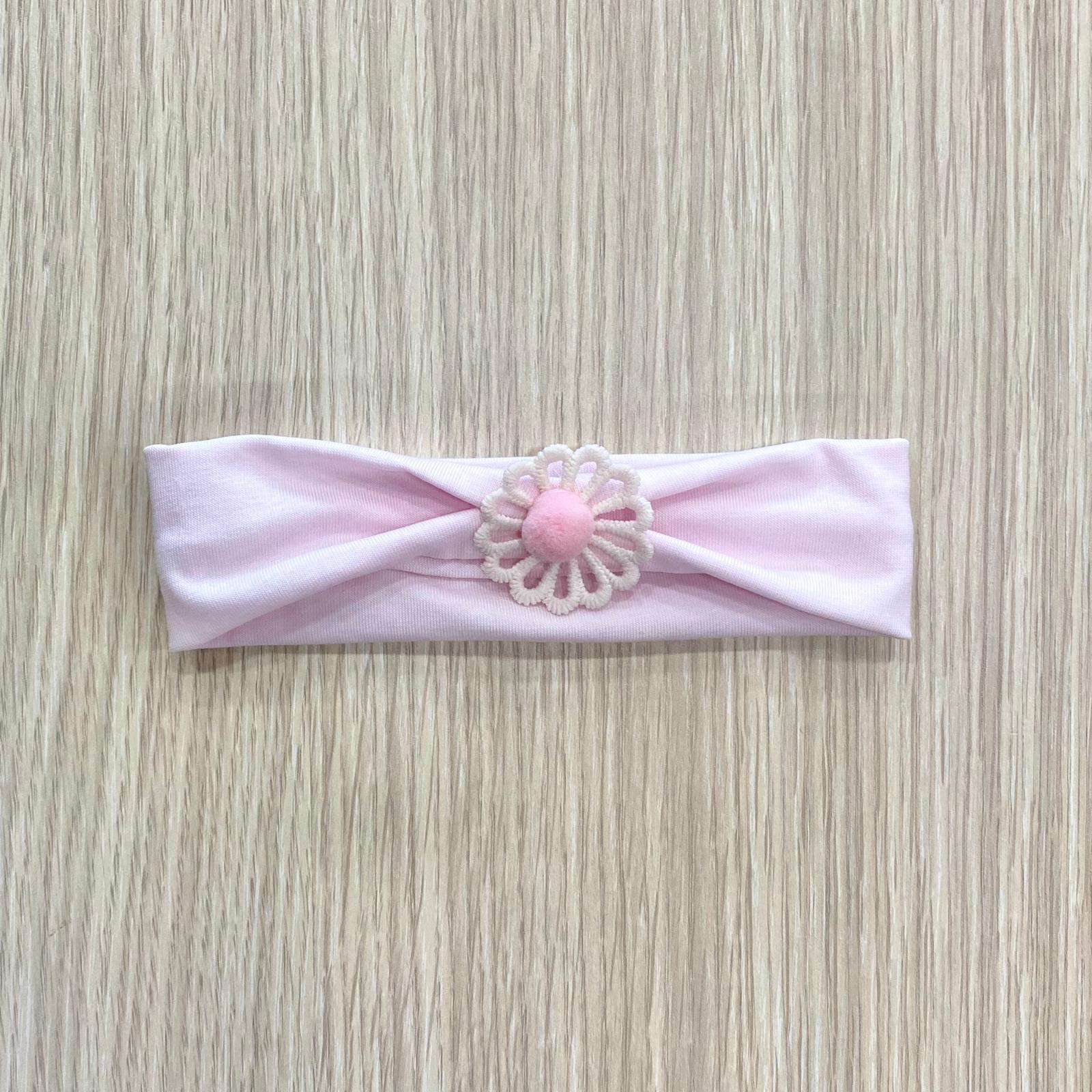 Fascetta neonata in cotone, di colore rosa, con applicazione in rilievo.