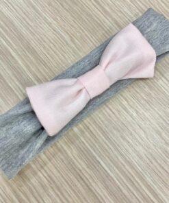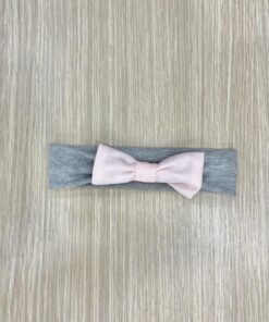 Fascetta neonata in morbido tessuto di colore grigio con applicazione di fiocchetto di colore rosa.