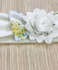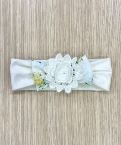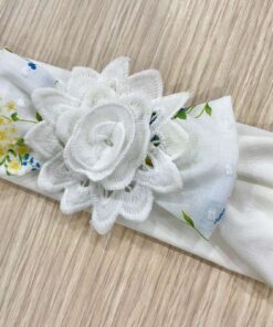 Fascetta neonata in cotone, di colore panna con applicazione di fiorellino in pizzo sangallo e dettagli di vari colori.