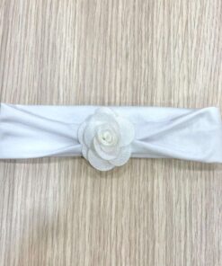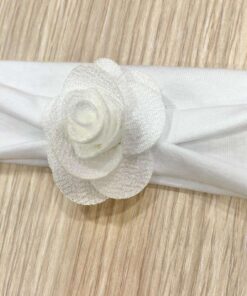 Fascetta neonata in cotone, di colore bianco con applicazione di fiorellino in tessuto.