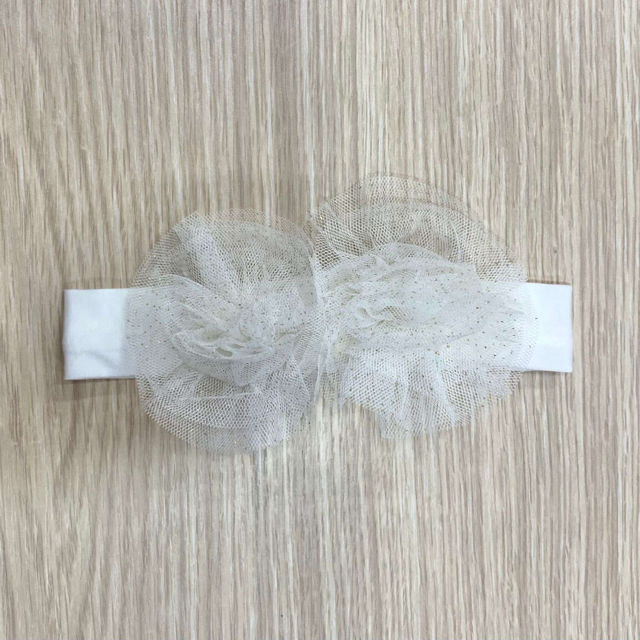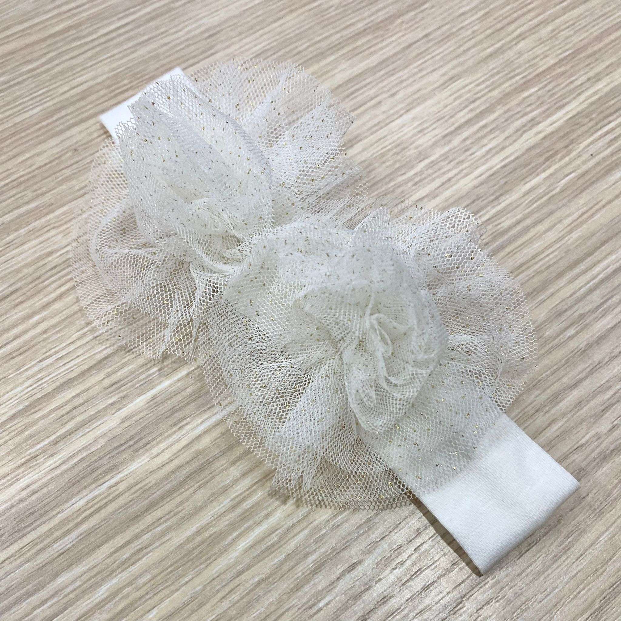 Fascetta neonata in cotone elasticizzato, di colore panna, con applicazione di fiori in tulle, con glitter dorati.