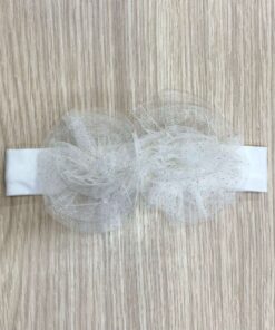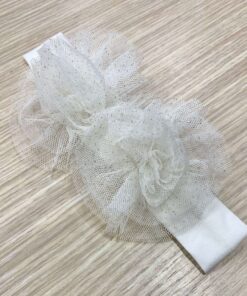 Fascetta neonata in cotone elasticizzato, di colore panna, con applicazione di fiori in tulle, con glitter dorati.