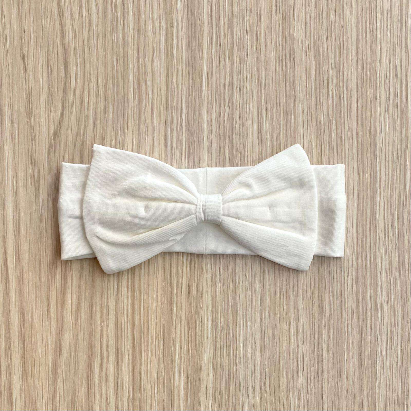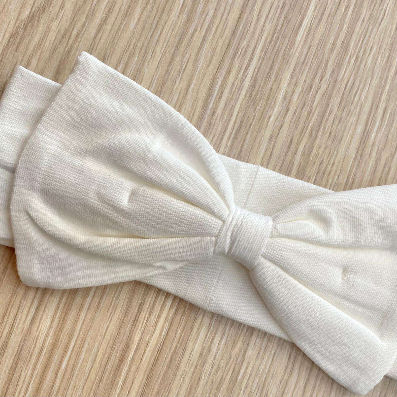 Fascetta neonata in cotone, di colore panna, con dettaglio di fiocchetto in tessuto.