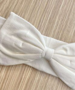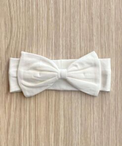 Fascetta neonata in cotone, di colore panna, con dettaglio di fiocchetto in tessuto.