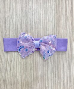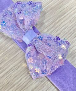 Fascetta neonata di colore lilla, con applicazione fiocco in tulle e fiorellini olografici.