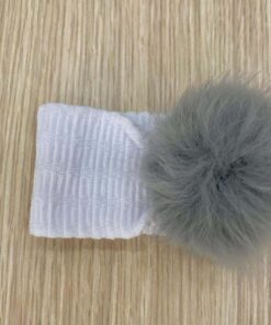 Fascetta neonata in morbido tessuto elasticizzato di colore bianco con pom pom di colore grigio.