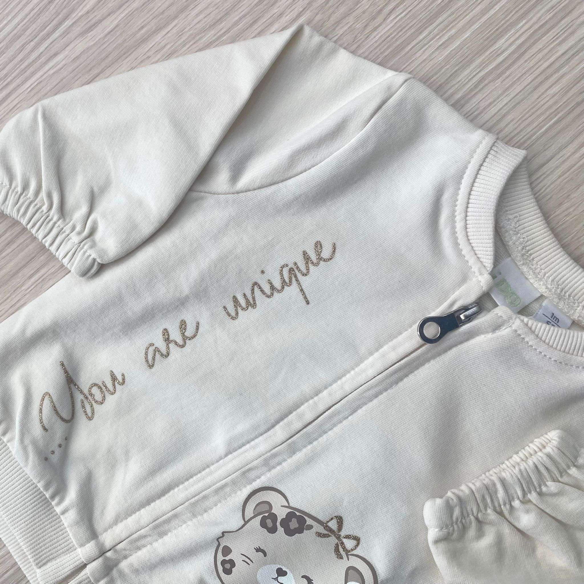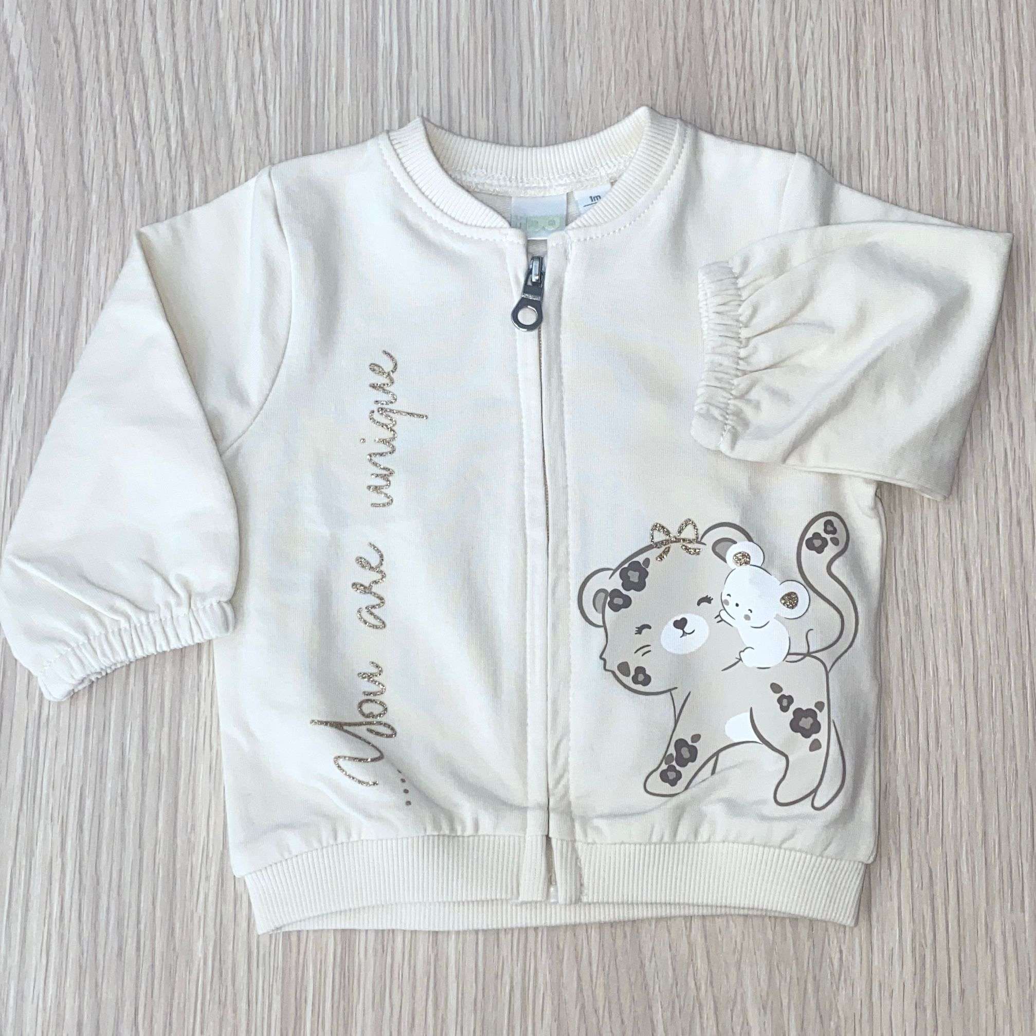 Il modello con zip frontale assicura una vestibilità facile e veloce, mentre i polsini elasticizzati offrono una tenuta confortevole senza stringere. Il tenero disegno dell’orsetto con cucciolo sul davanti, insieme alla scritta decorativa laterale, aggiunge un tocco dolce e raffinato al capo.