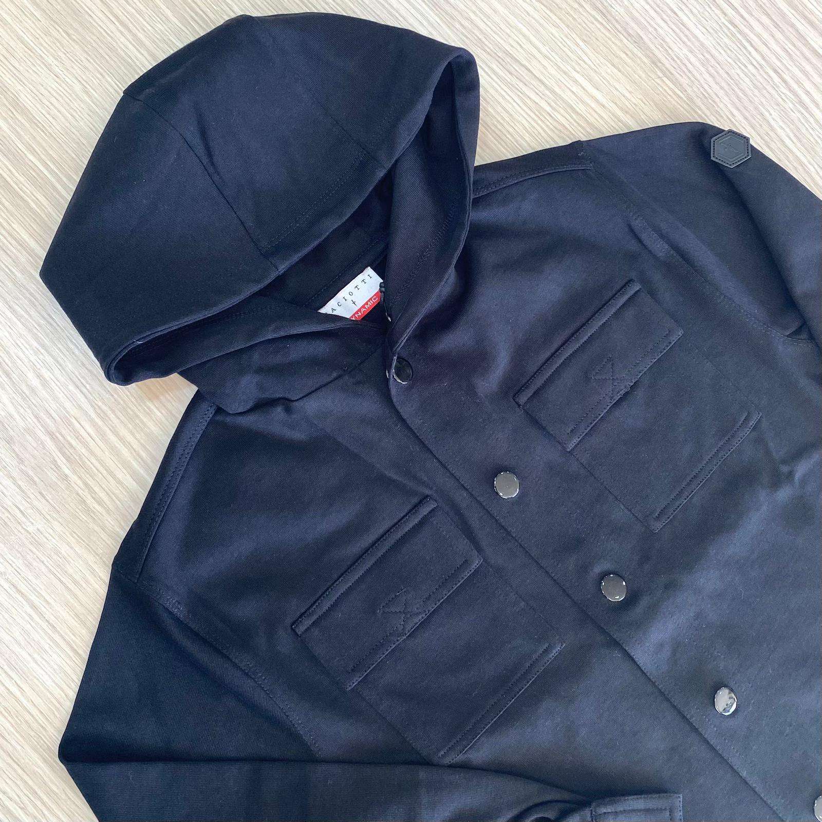 Giacca bambino/ragazzo in cotone, di colore nero, firmata Paciotti Dynamic, perfetta per la mezza stagione. Modello con cappuccio fisso, chiusura frontale con bottoni a pressione e tasche applicate sul petto con pattina. Stile casual e grintoso, ideale da abbinare a jeans o pantaloni jogger. Logo tono su tono su una manica per un tocco distintivo e discreto. Morbida, comoda e versatile, pensata per i ragazzi dallo stile moderno.