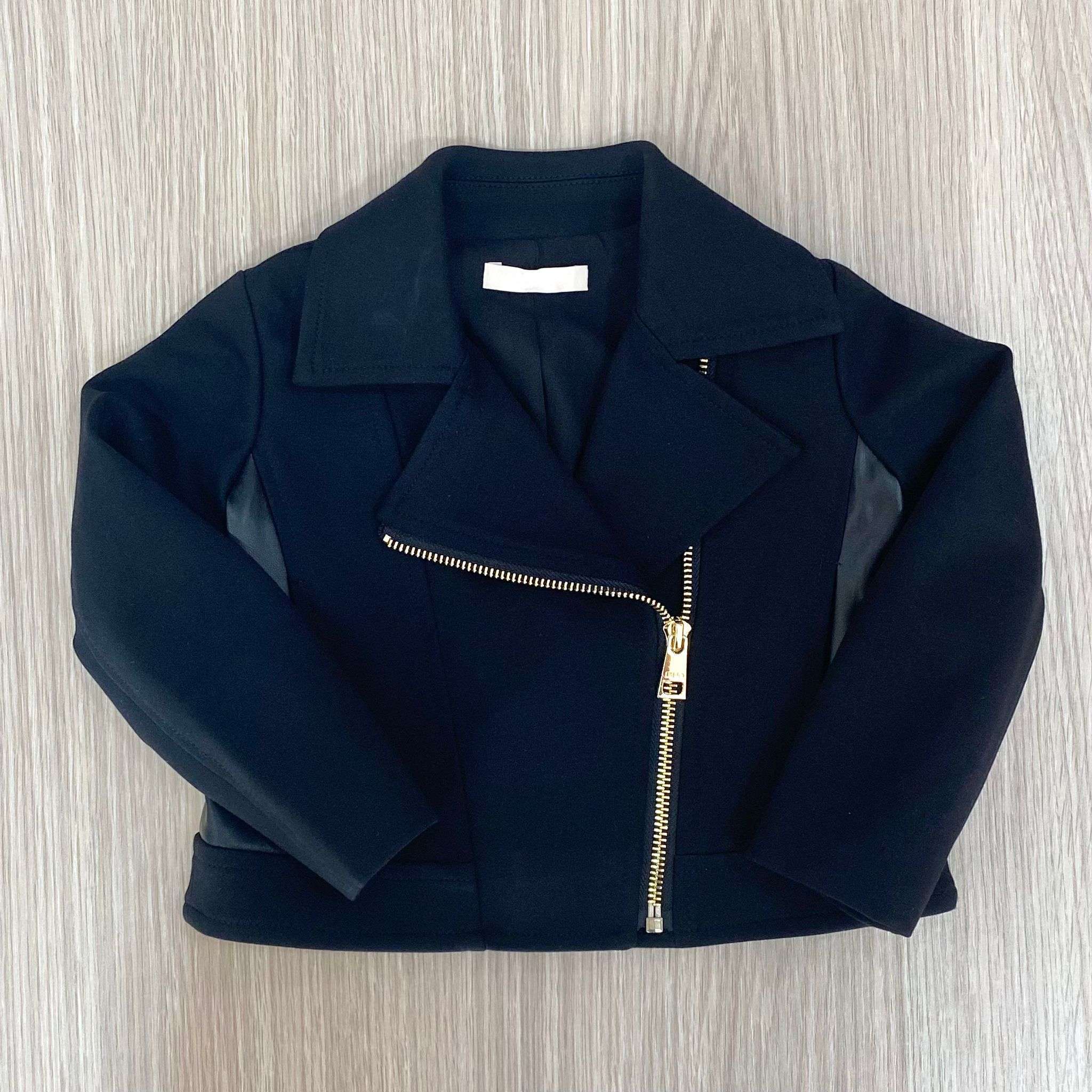 Giubbotto bambina in caldo cotone, di colore nero, con dettaglio in ecopelle, logo di colore oro.