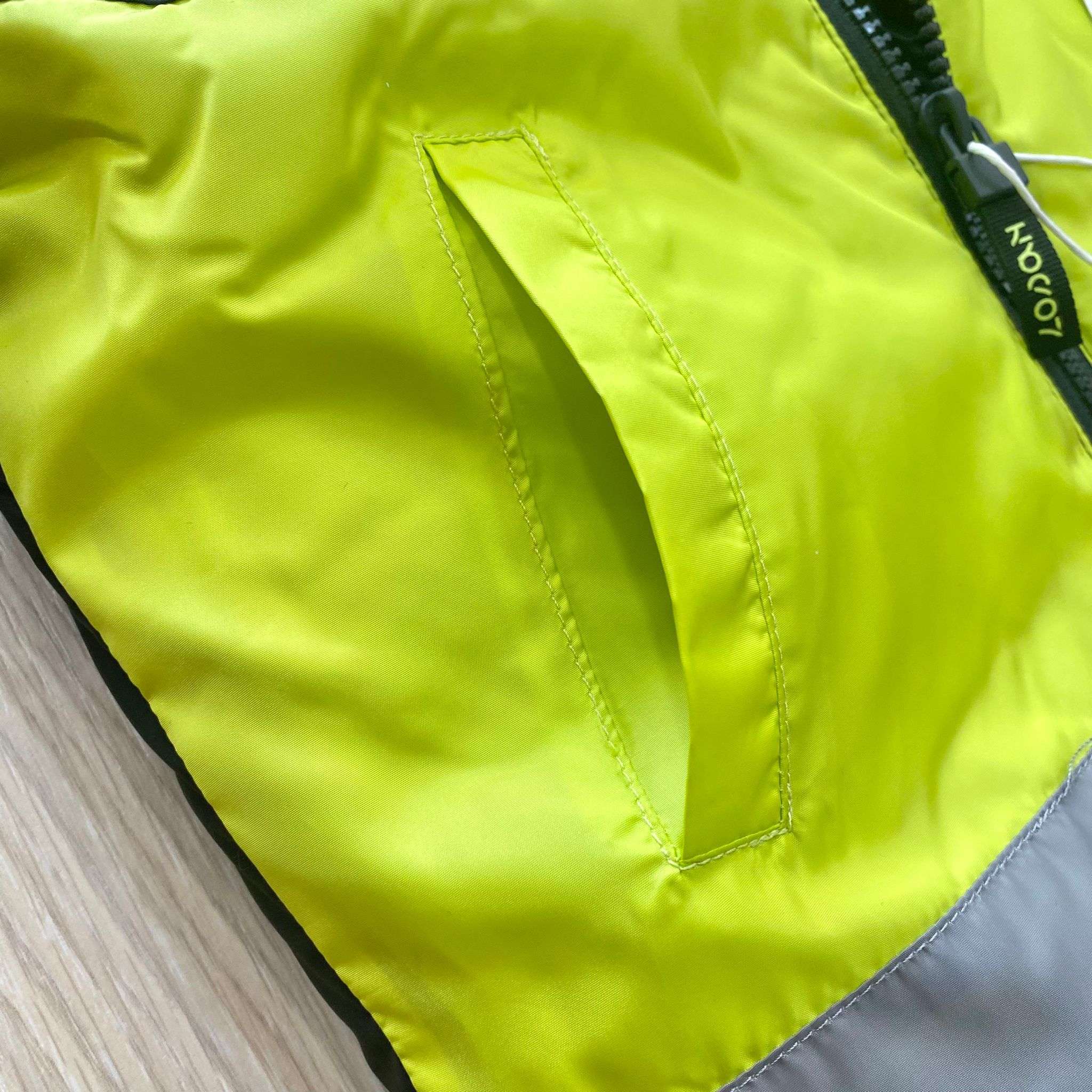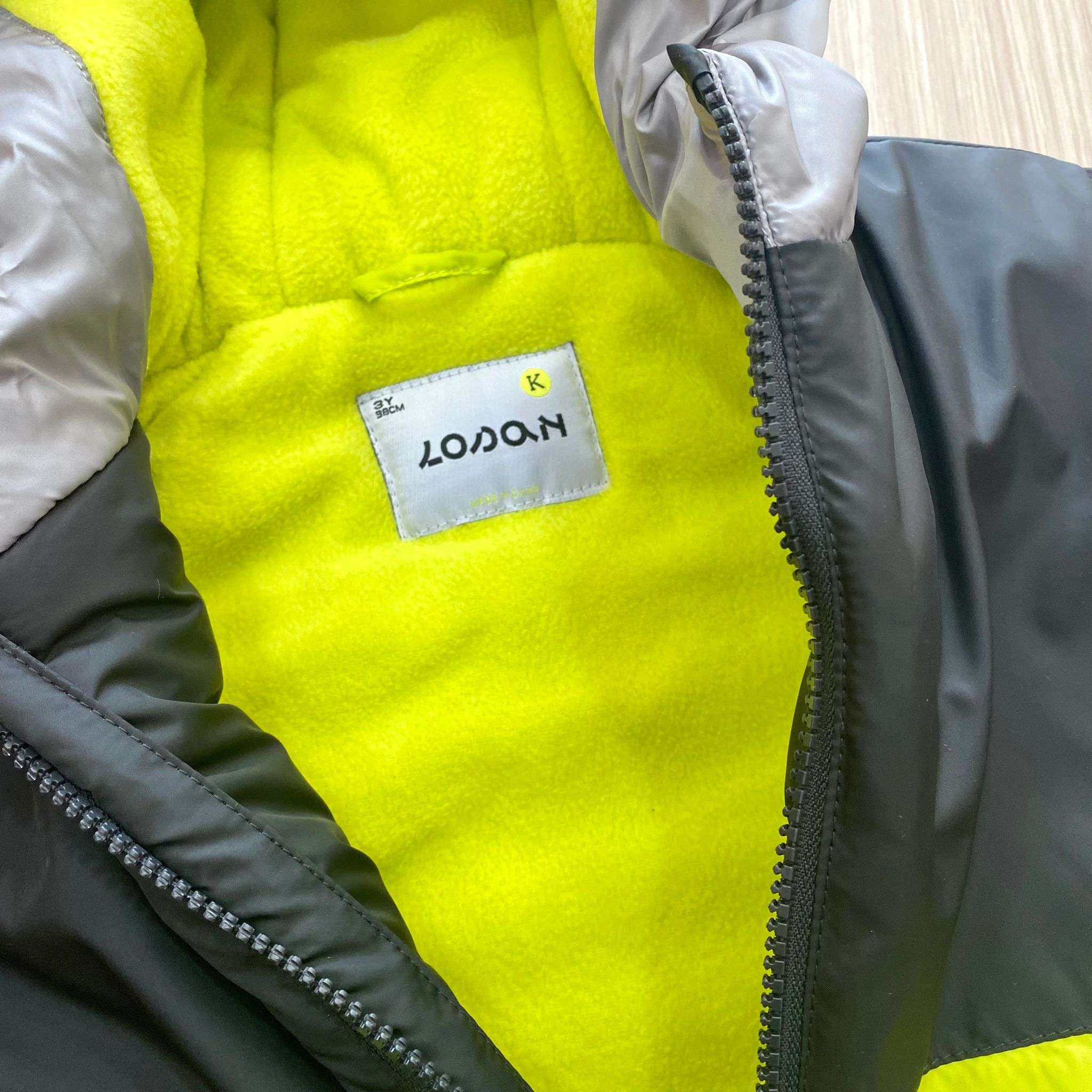 Parka bambino imbottito con interno in pile, di colore nero, grigio e lime.
