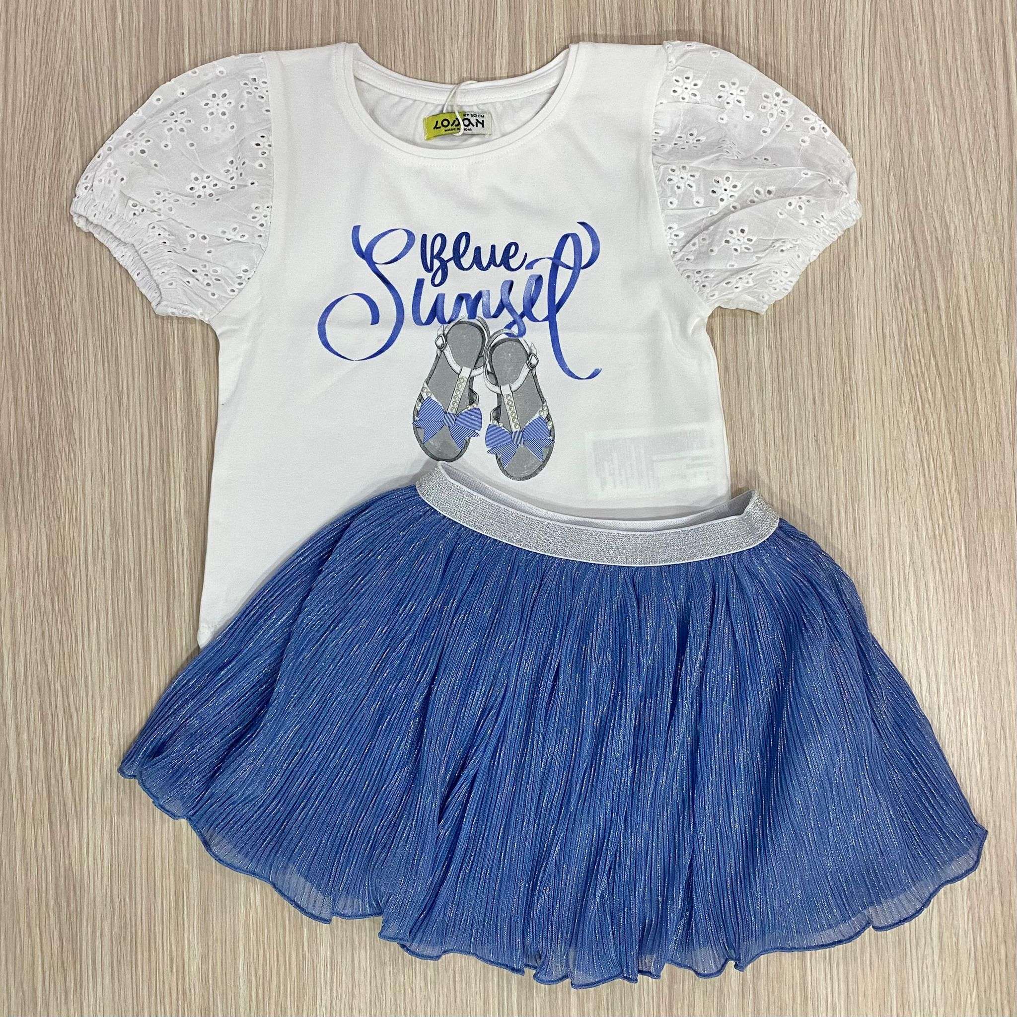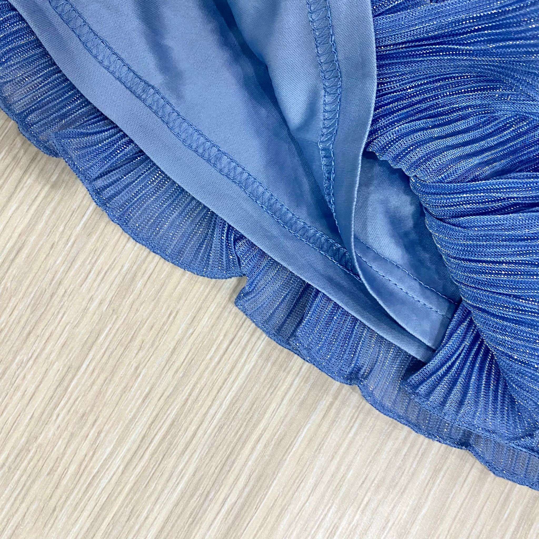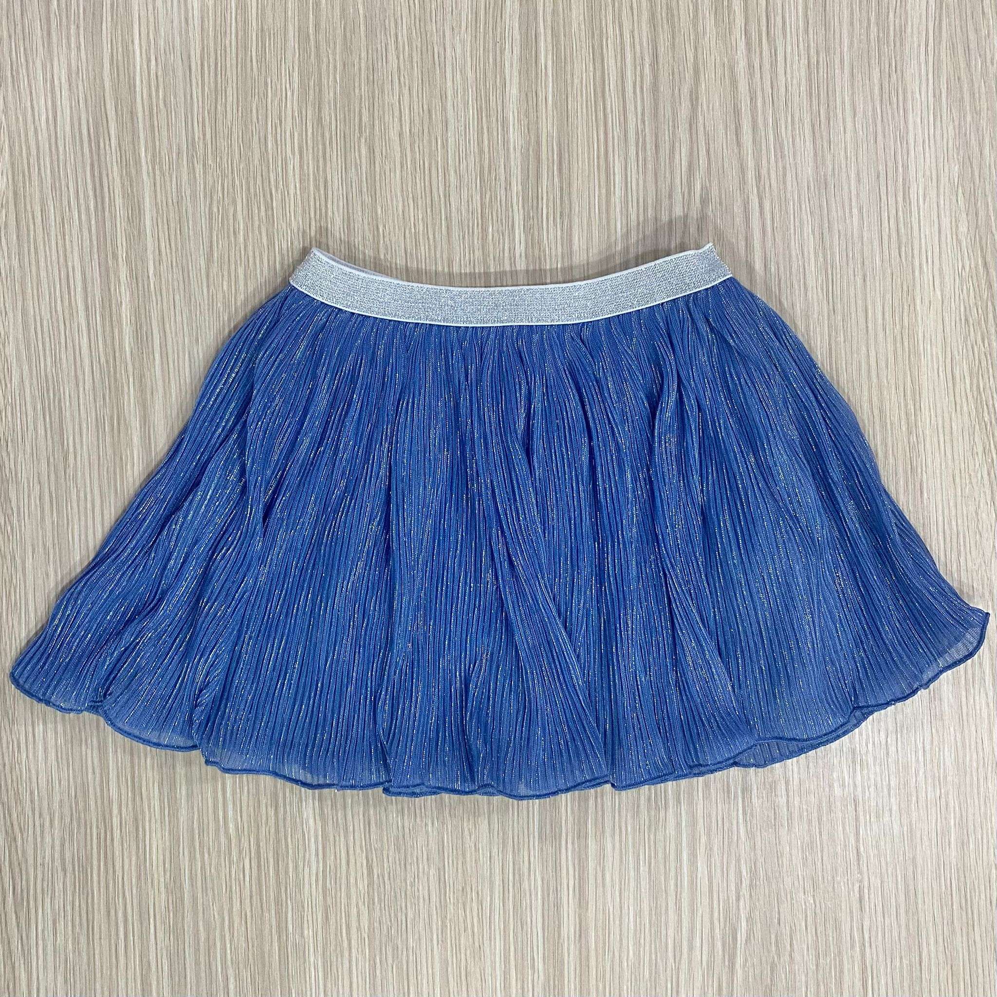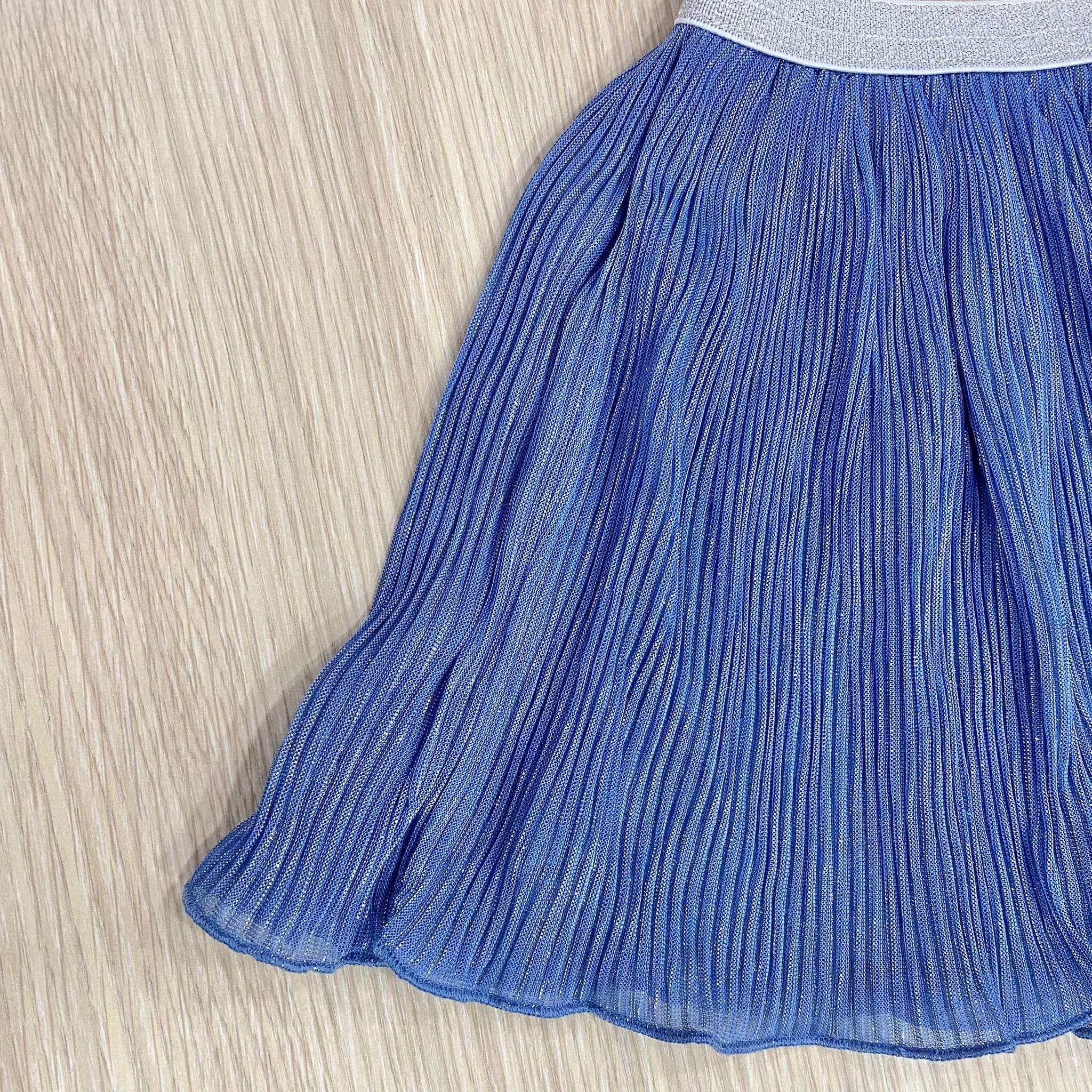 Gonna bambina plissettata laminata, di colore bluette e argento, con fascia elasticizzata in vita e fodera.