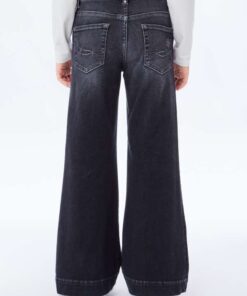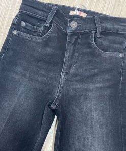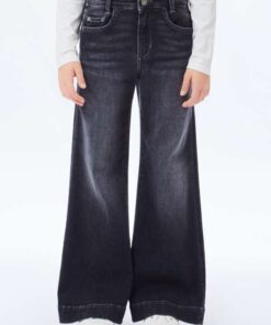 Jeans a zampa bambina/ragazza in denim grigio/nero, con elastico regolabile all’interno.