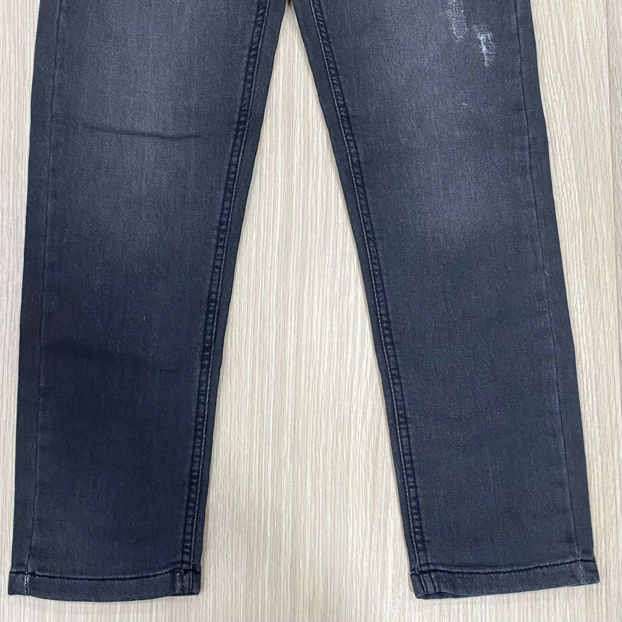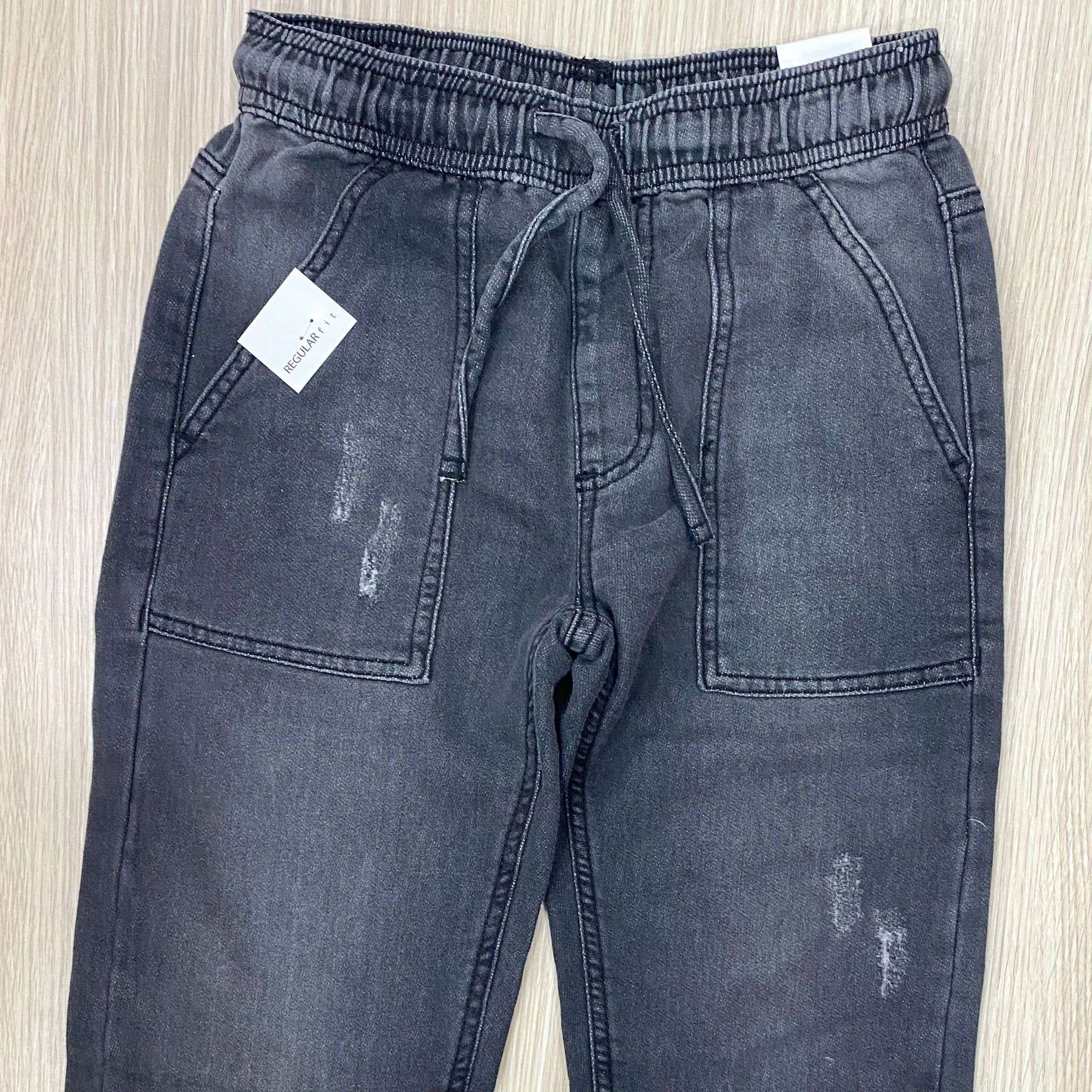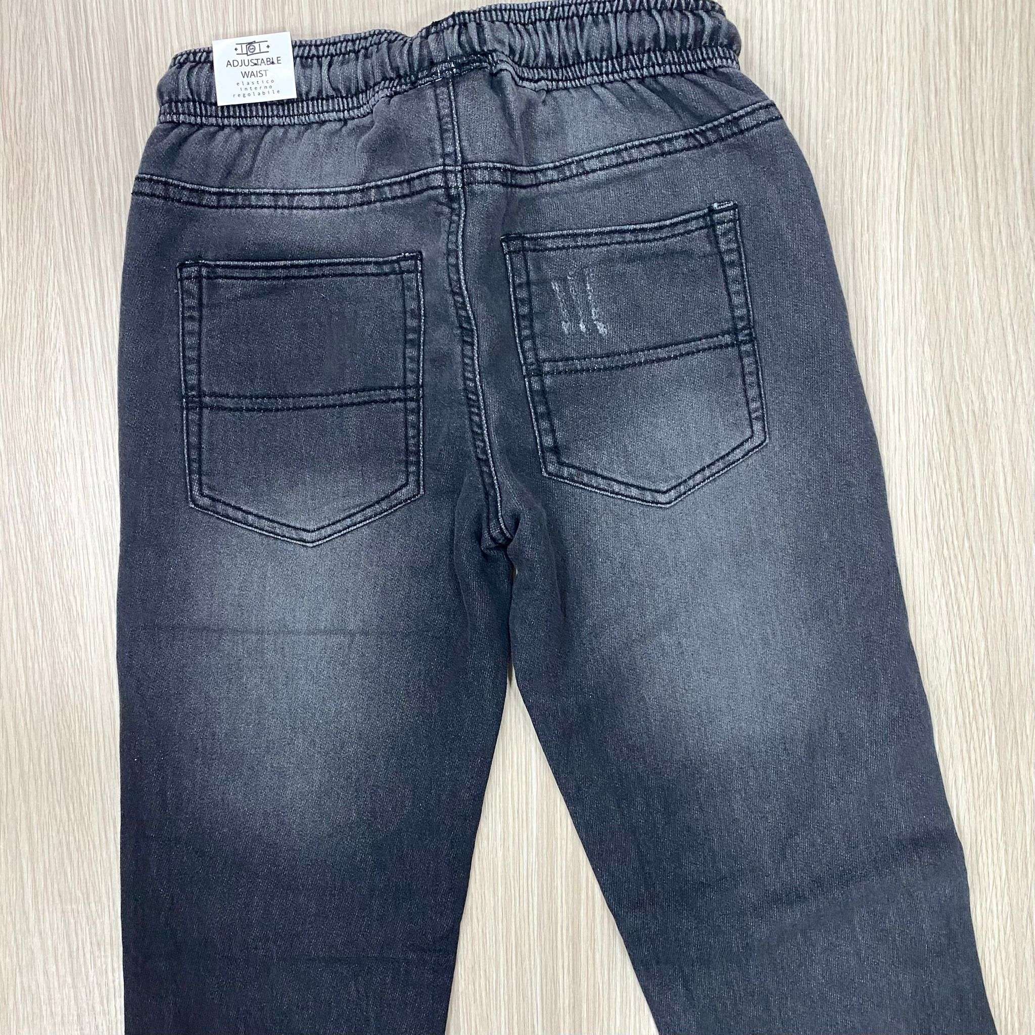 Jeans bambino/ragazzo in denim di cotone, di colore grigio scuro, con laccetto ed elastico regolabile.
