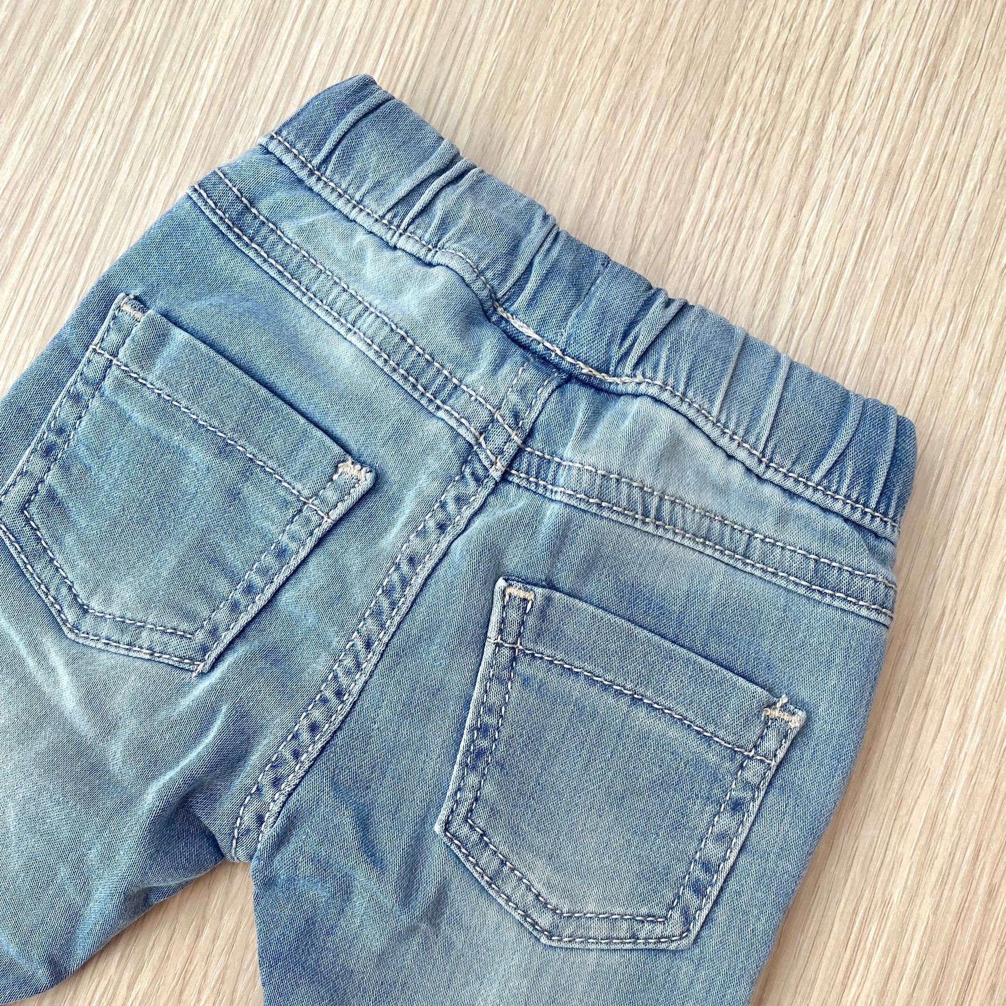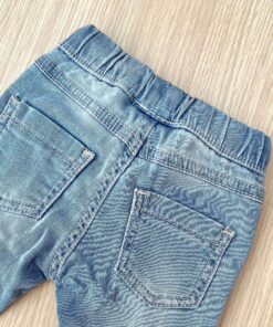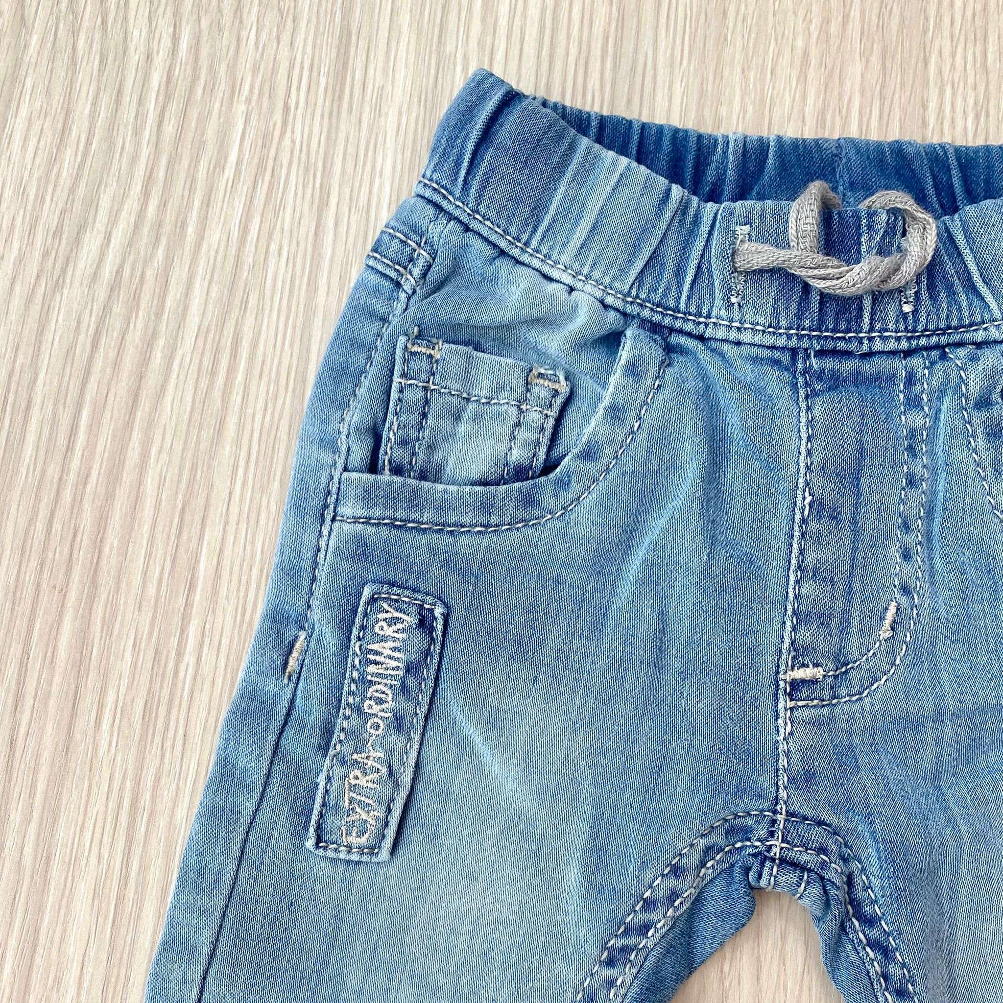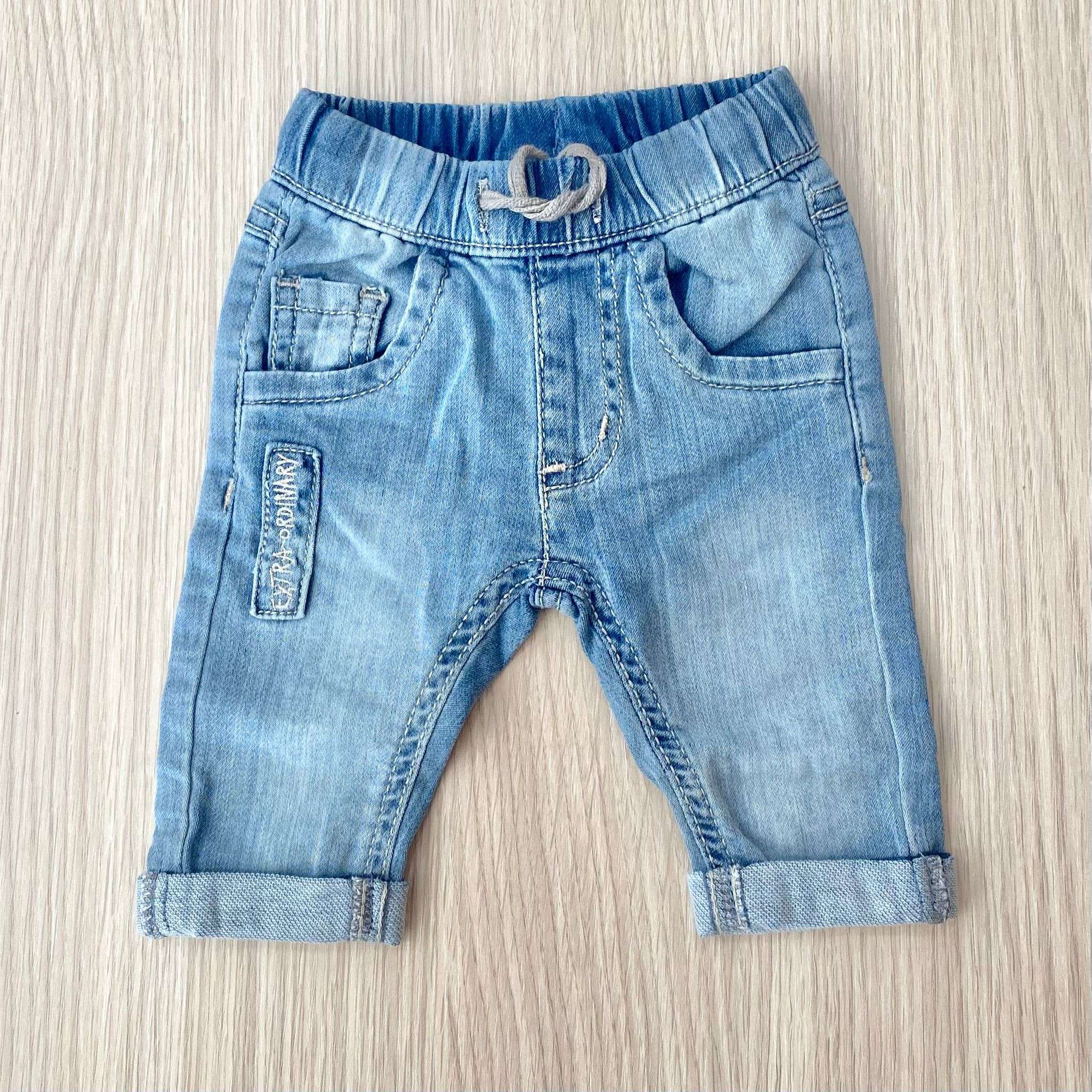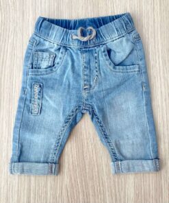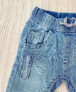 Jeans neonato/bambino in cotone adatto alla stagione primavera/estate, con dettaglio di tasche, con laccetto regolabile.
