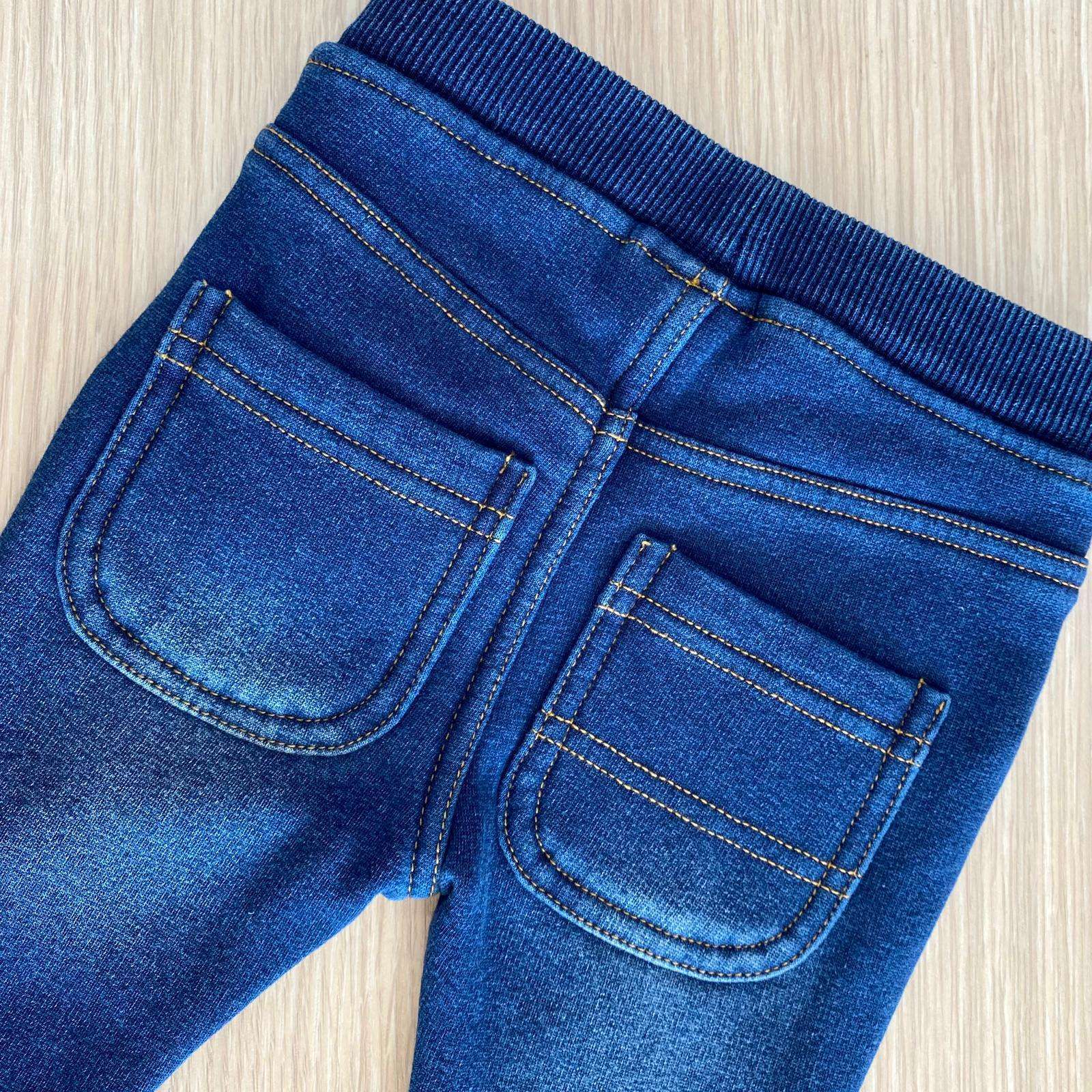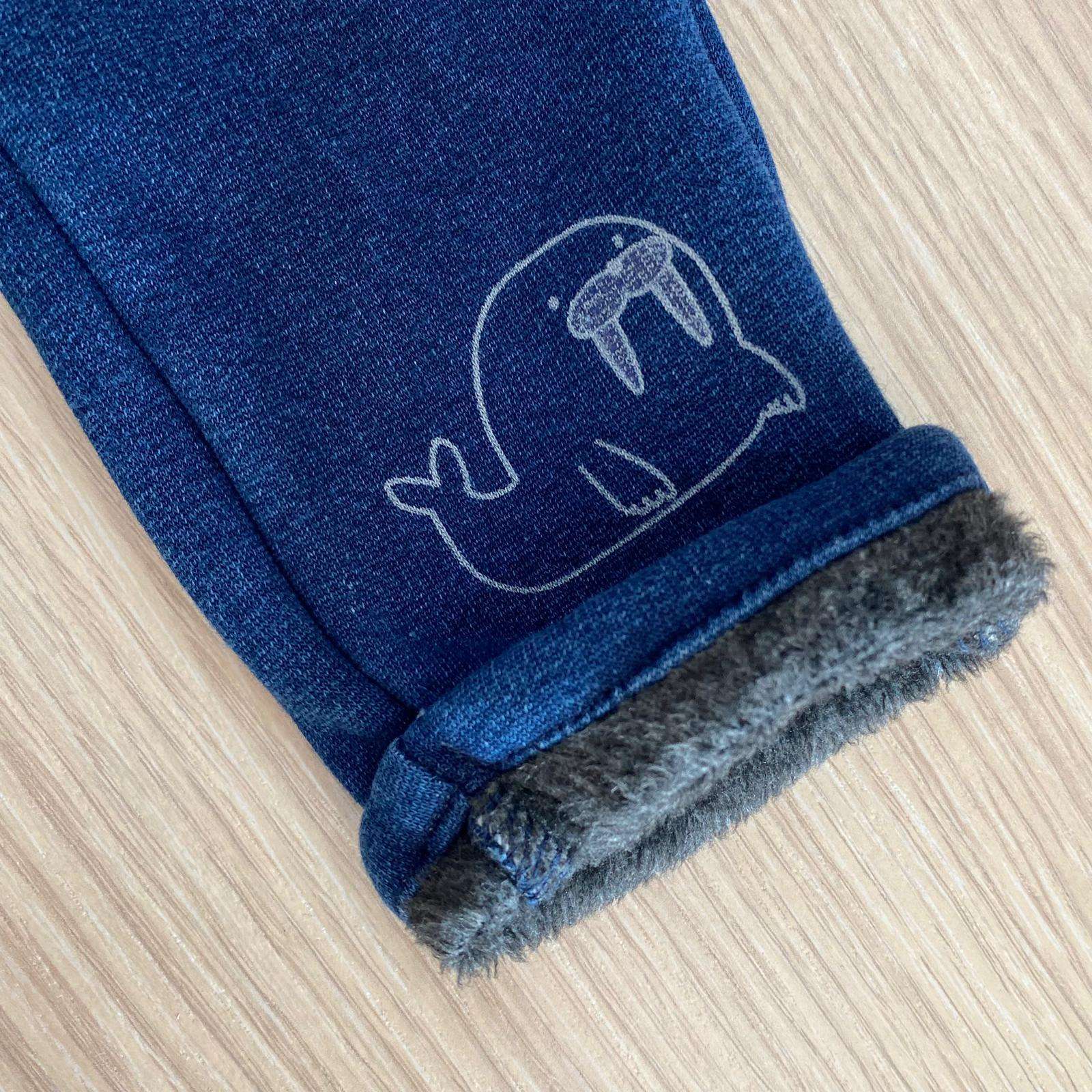 Jeans neonato/bambino in cotone felpato, con elastico regolabile e dettaglio di disegno.