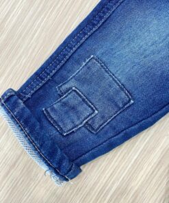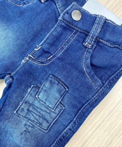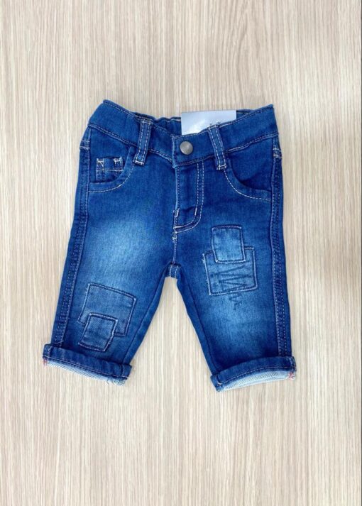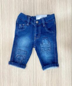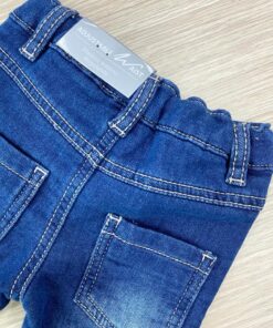 Jeans neonato in morbido cotone elasticizzato, con dettagli di finte toppe.
