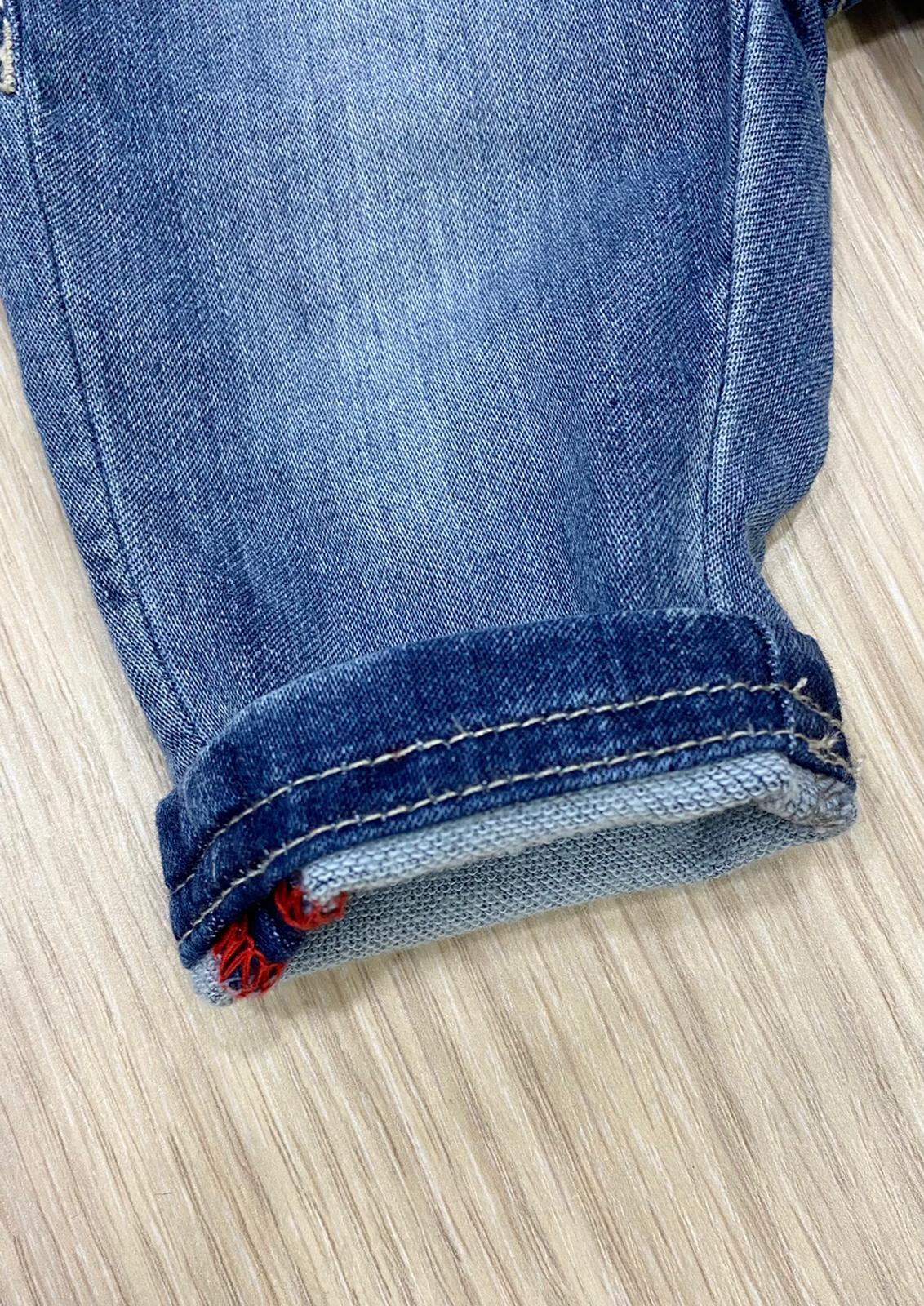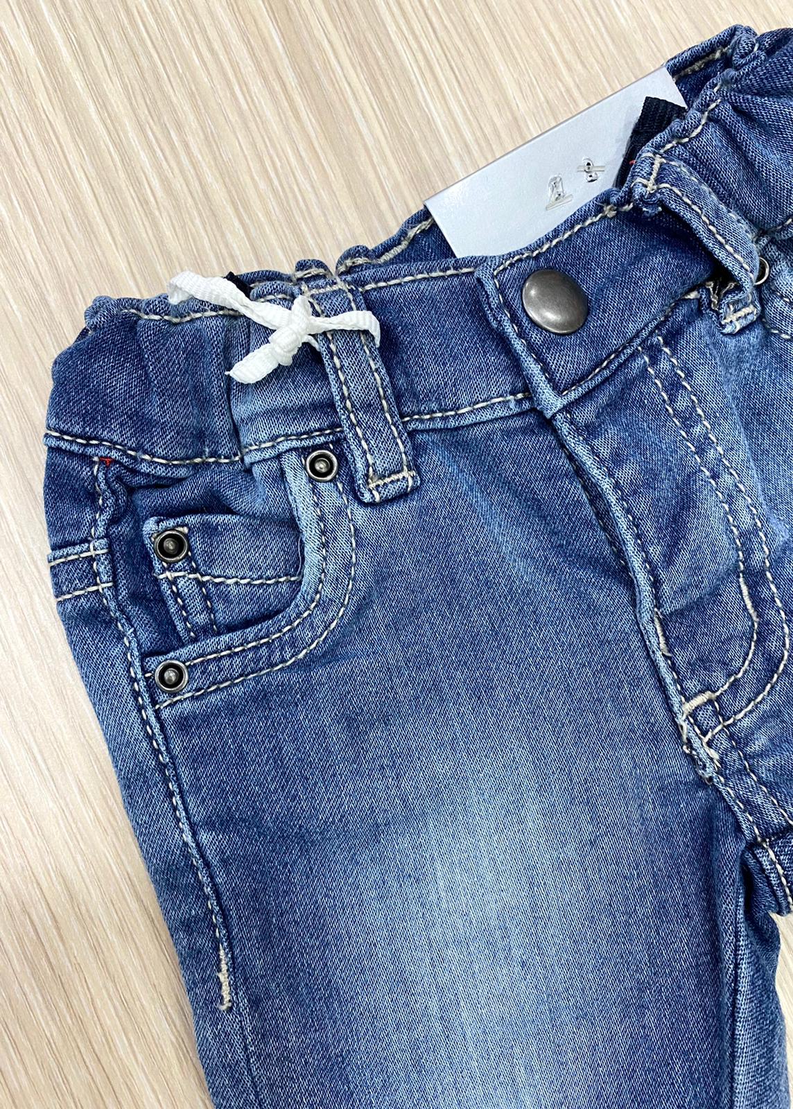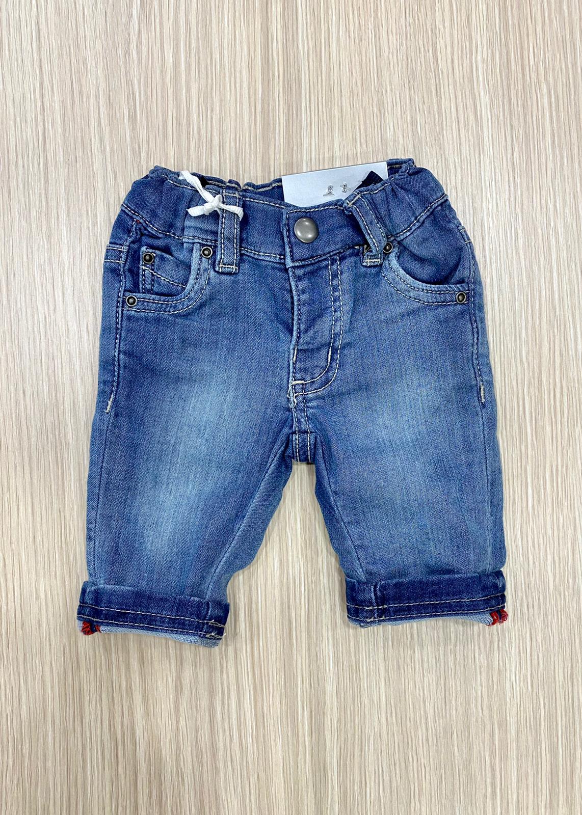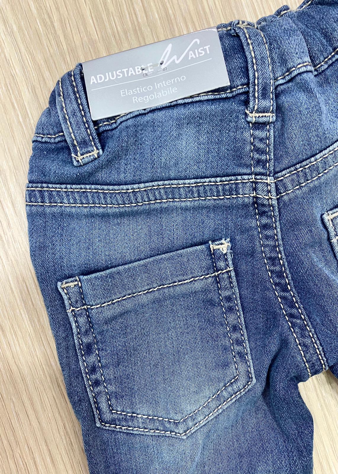 Jeans neonato in morbido cotone elasticizzato, chiusura facilitata con gancio.