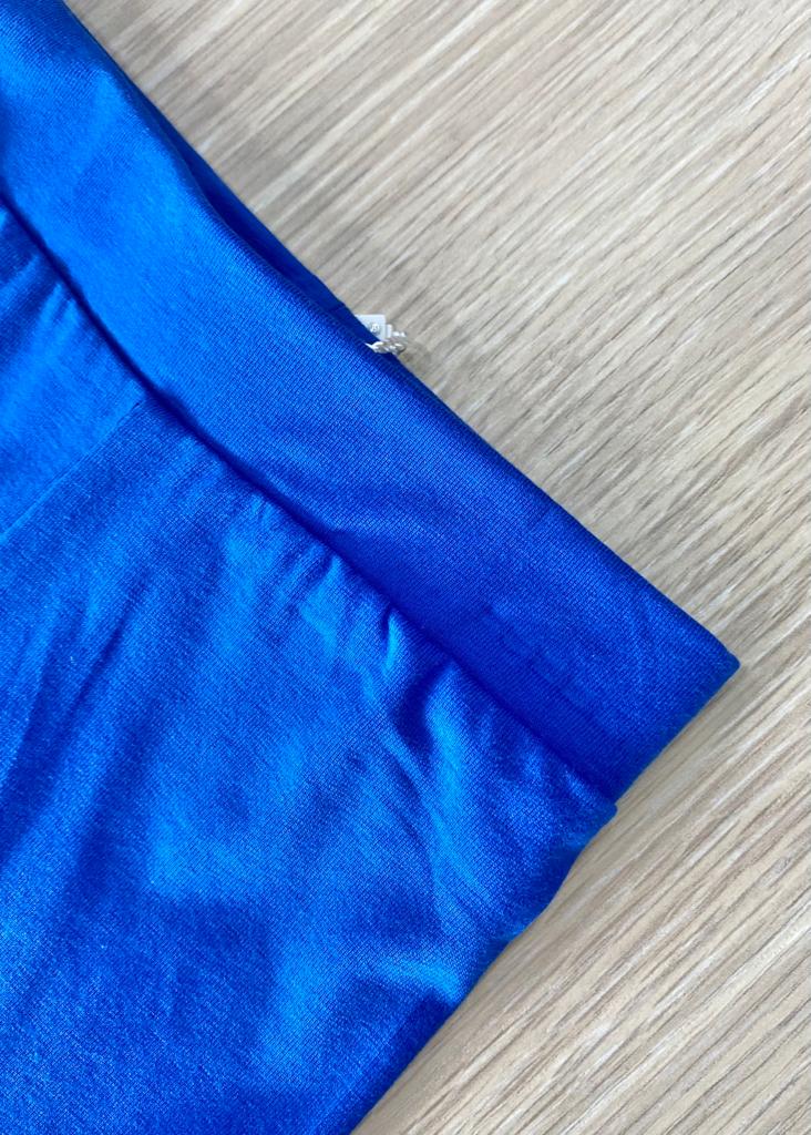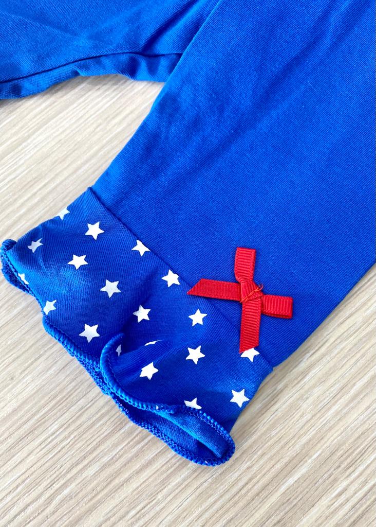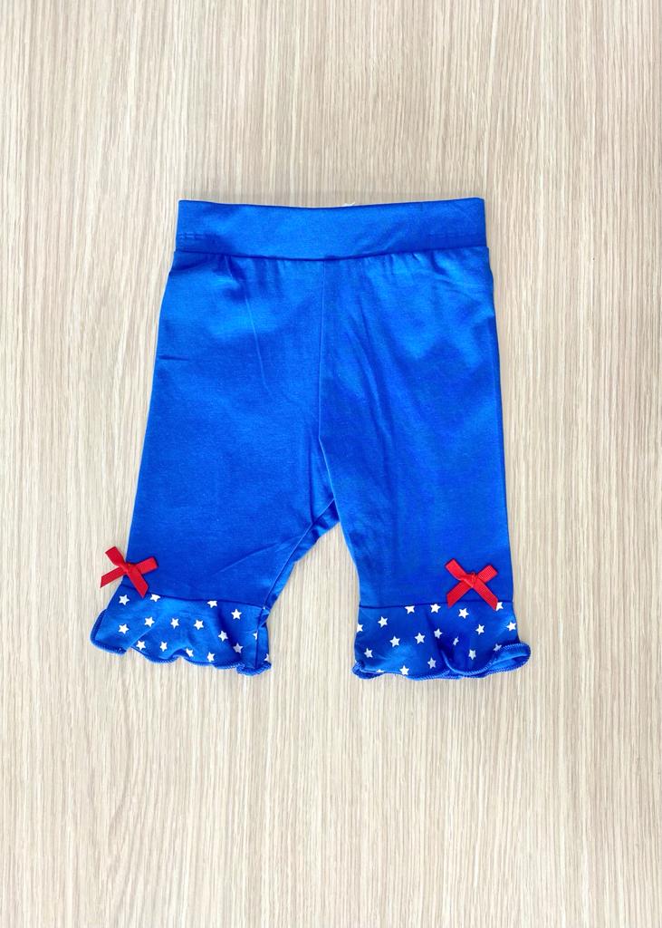 Leggings corto neonata/bambina, in morbido cotone, di colore blu con stampa di stelle e applicazione di fiocchetto di colore rosso.