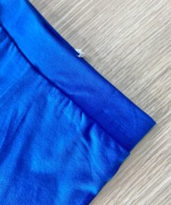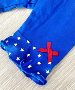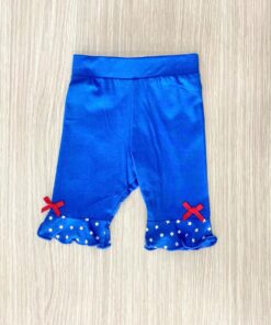 Leggings corto neonata/bambina, in morbido cotone, di colore blu con stampa di stelle e applicazione di fiocchetto di colore rosso.